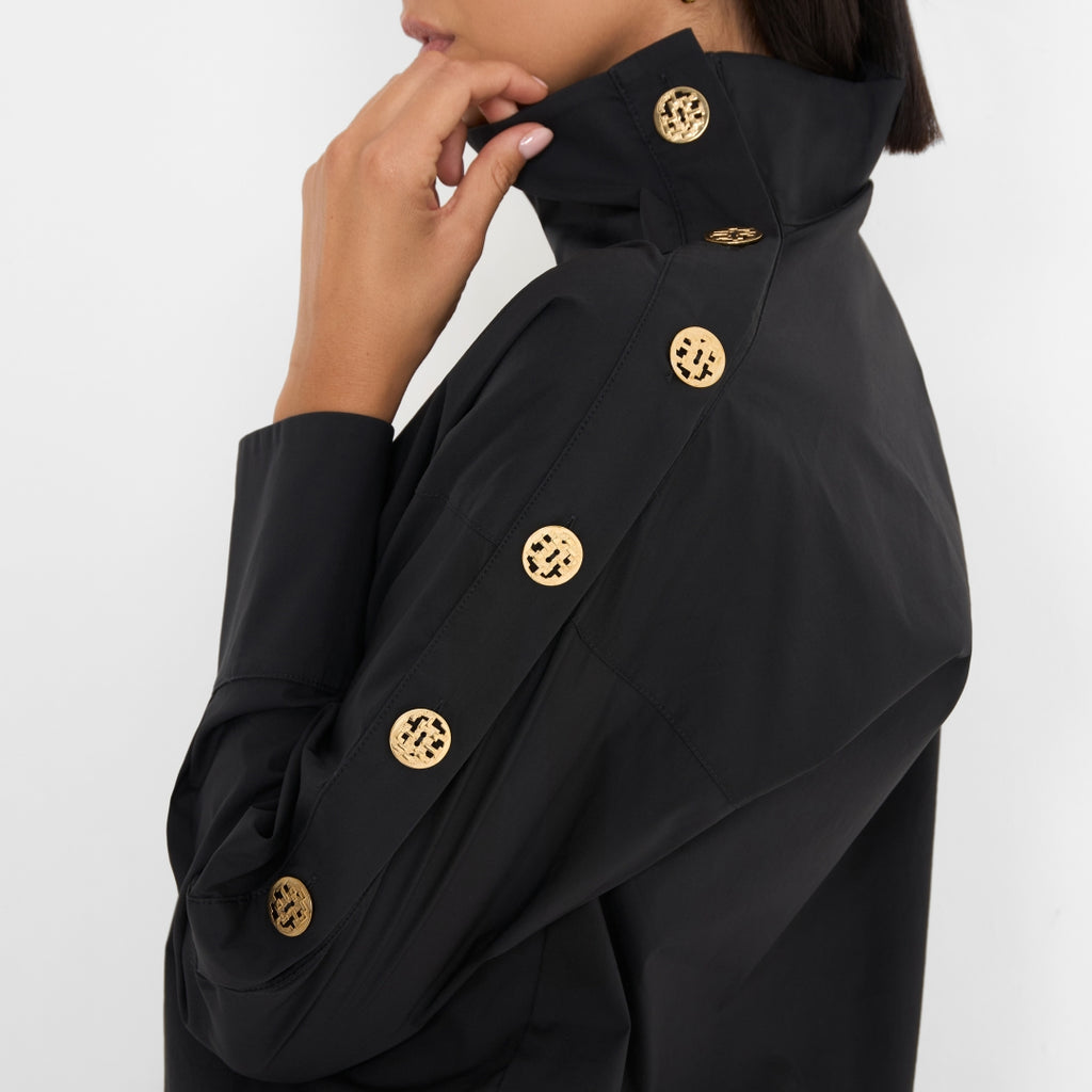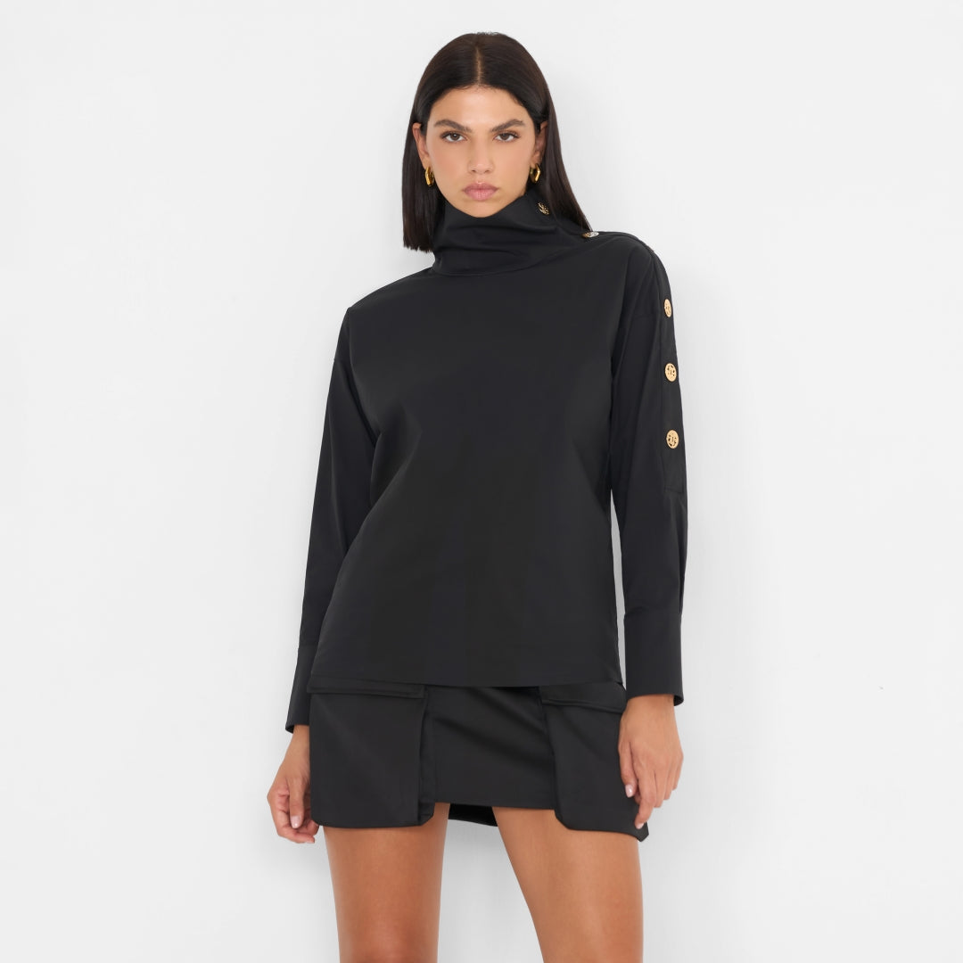 Camicia collo alto con bottoni in oro su spalle e maniche. La vestibilità è regolare leggermente over.