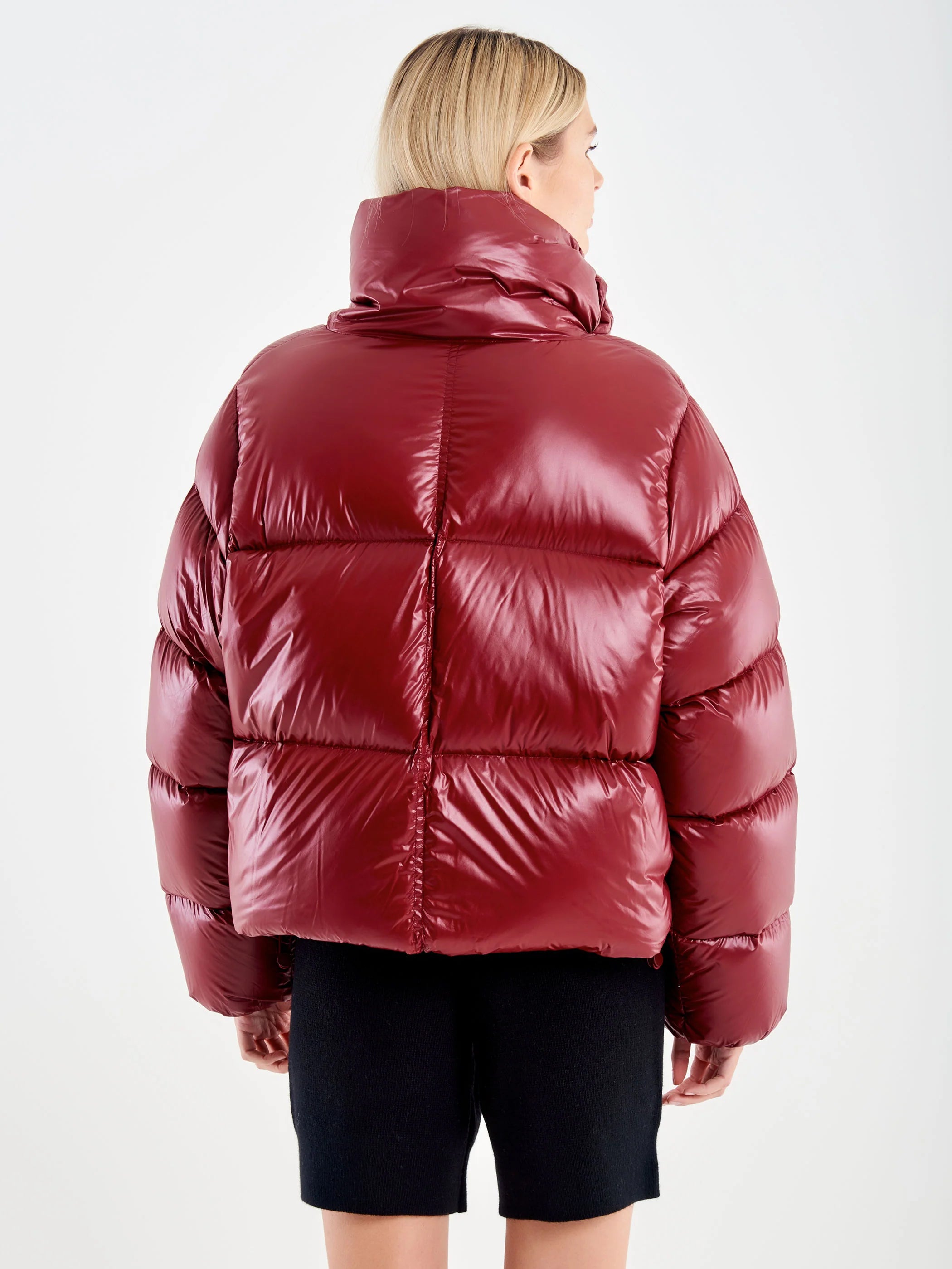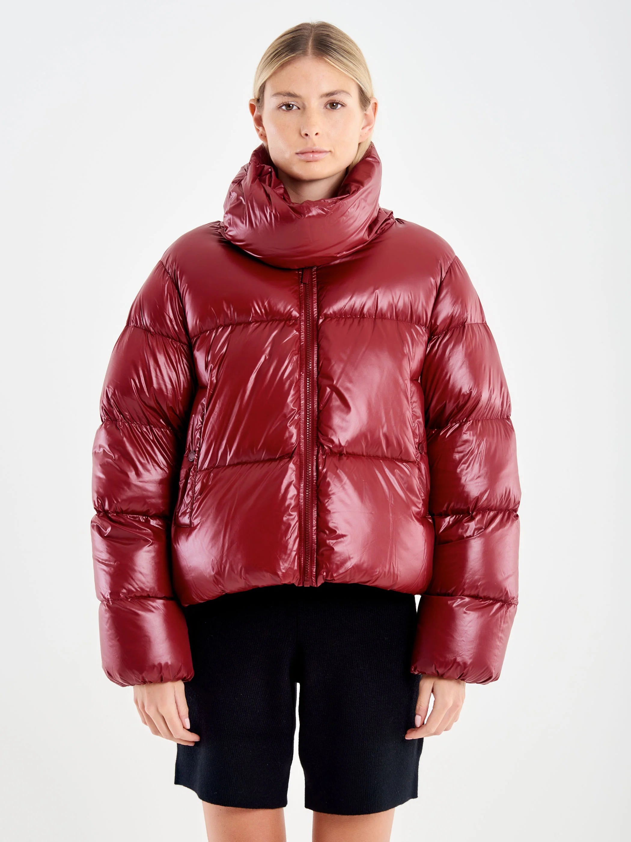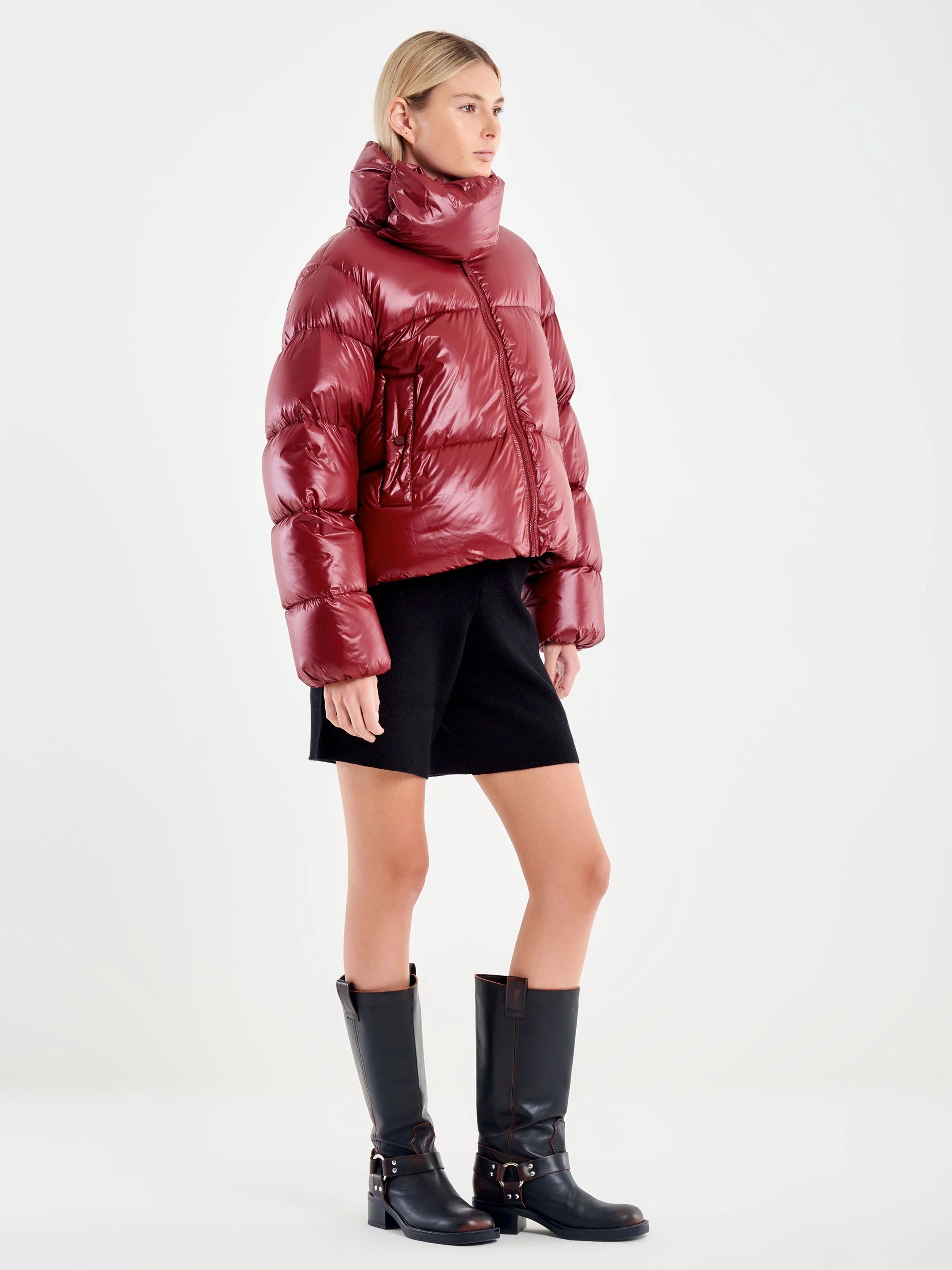 Piumino corto maniche lunghe con collo alto asimmetrico. Chiusura frontale con zip- Tasche laterali a filetto.