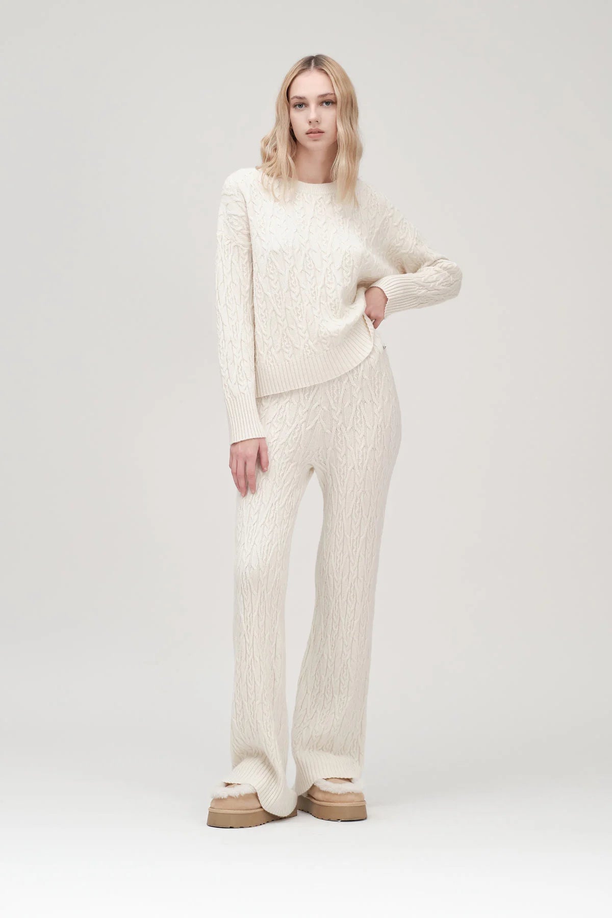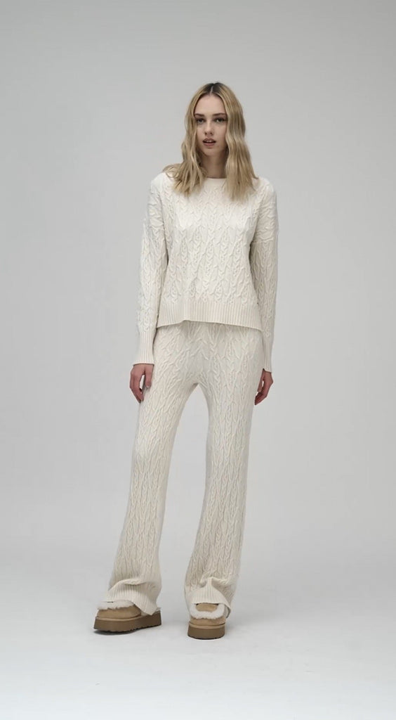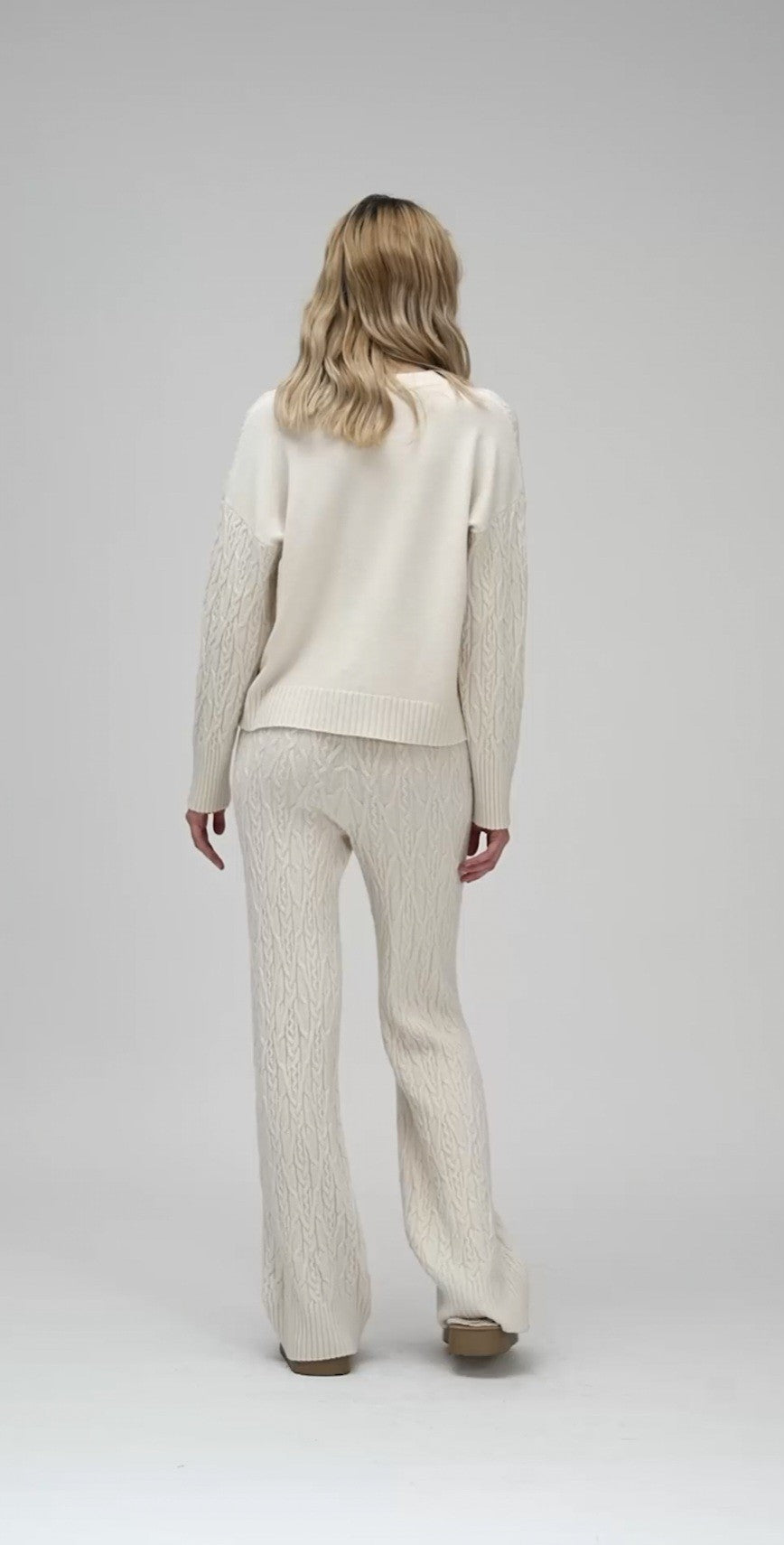 Coordinato in maglia di viscosa, poliestere e lana. Sia la maglia che i pantaloni presentano una lavorazione a trecce.