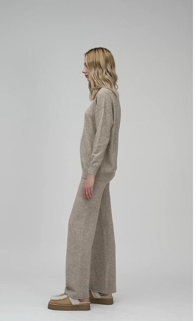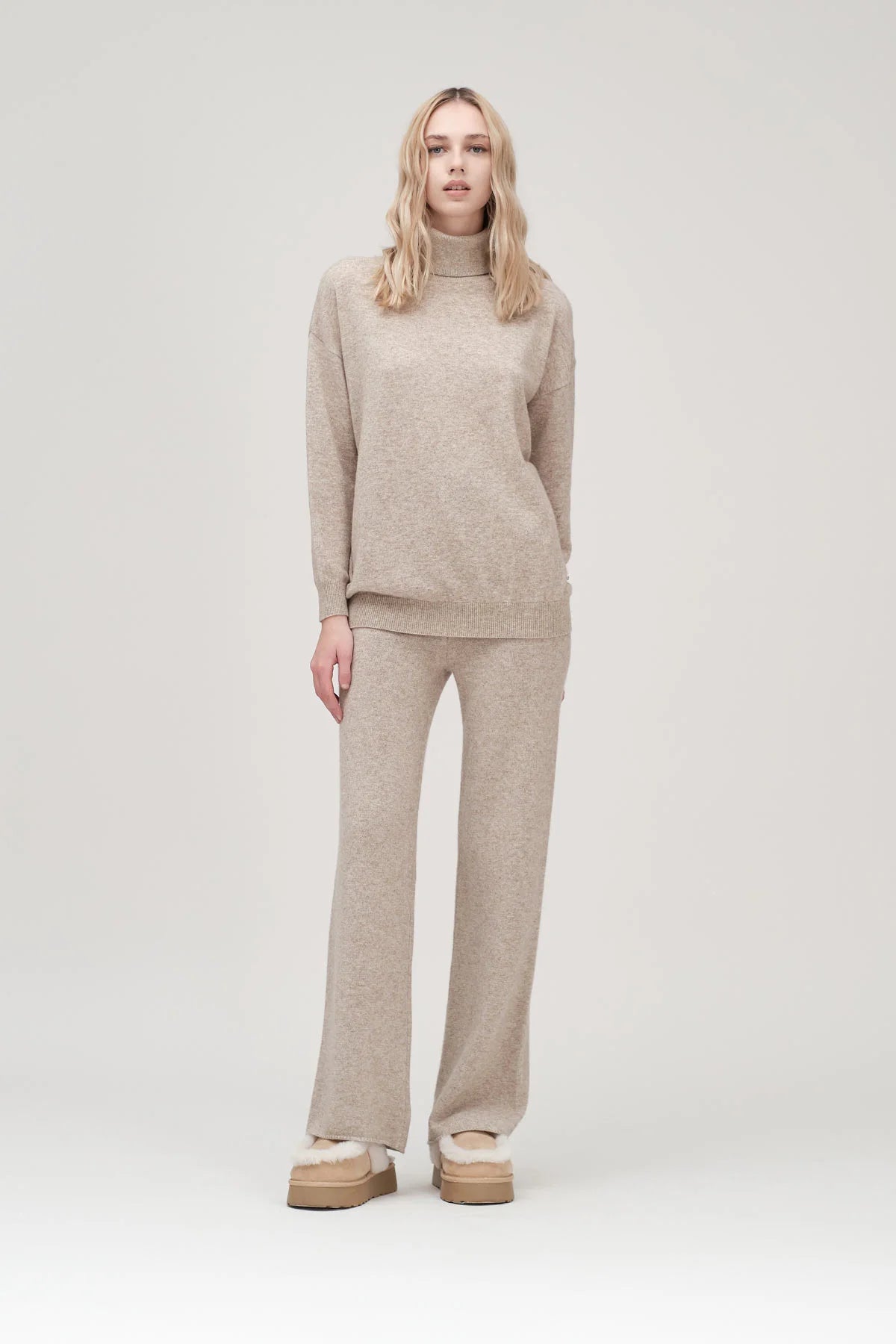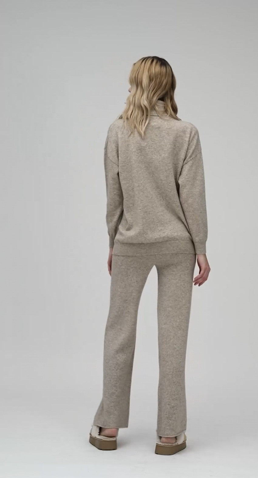 Coordinato in cashmere con dolcevita e pantaloni svasati.