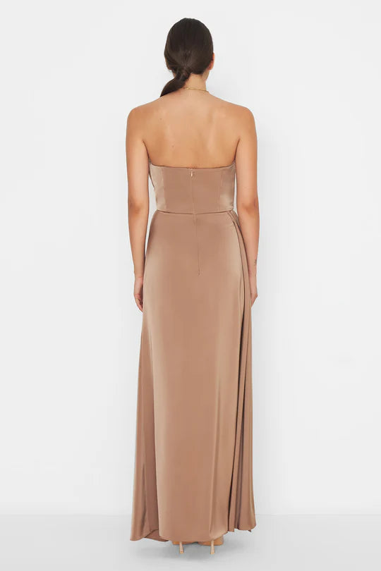 Abito lungo in raso con drappeggi che valorizzano la silhouette. Spacco laterale che gioca con una fusciacca sovrapposta. Corpetto steccato con scollatura a cuore.