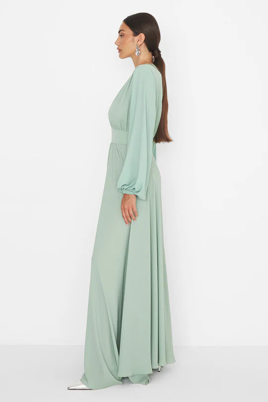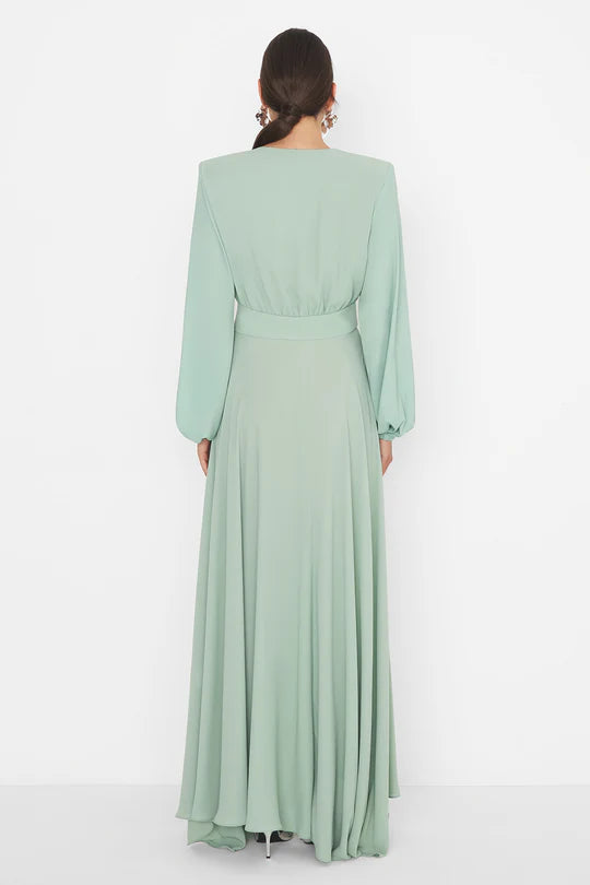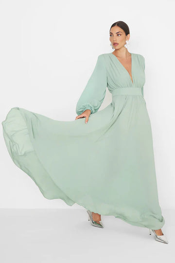 Abito lungo in chiffon leggero. Scollo a V, gonna ampia dalla linea fluida. La cintura in ecopelle sottolinea con eleganza la vita