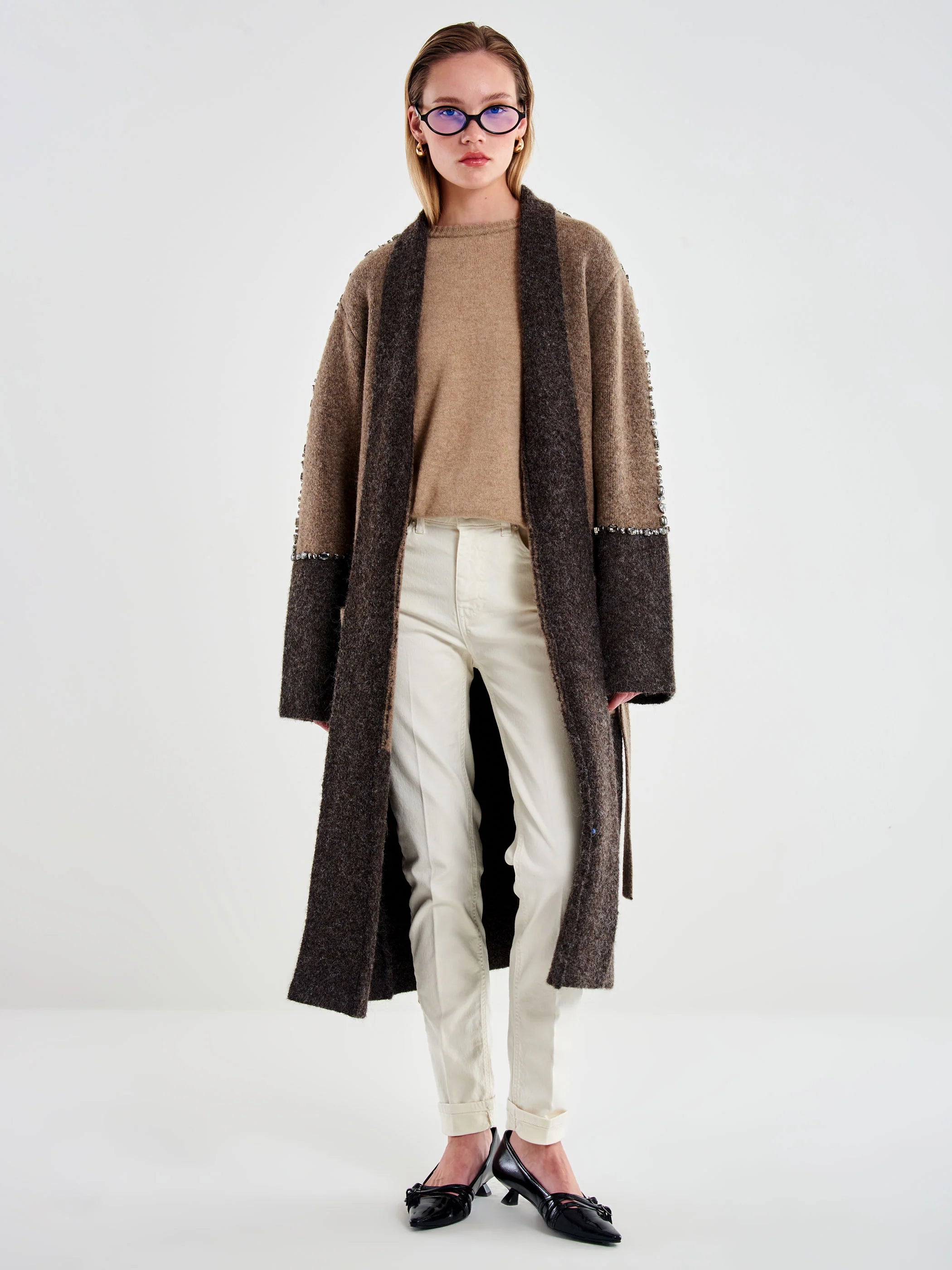 Cappotto lungo in maglia a maniche lunghe con tasche applicate. Dettaglio cabochon effetto gioiello applicati su maniche. Revers a contrasto