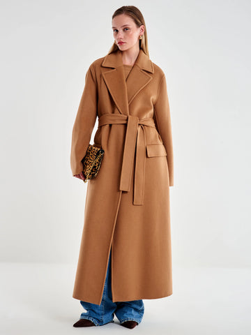Cappotto lungo sciallato in misto lana. Collo a revers e tasche con pattina applicate sulla parte anteriore. Chiusura con cintura dello stesso tessuto. dettaglio interno imbottito.
