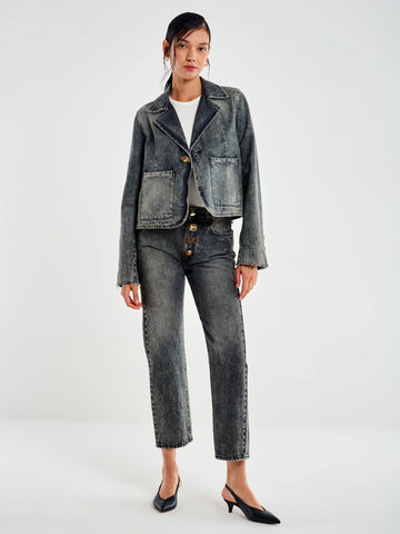 Giacca modello crop in denim nero con schiariture. Rotture sulla parte inferiore,tasche a top e collo rever. Chiusura frontale con bottone gioiello. Bottoni gioiello applicati sulla manica.