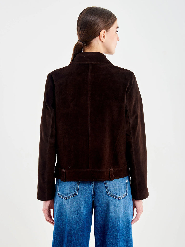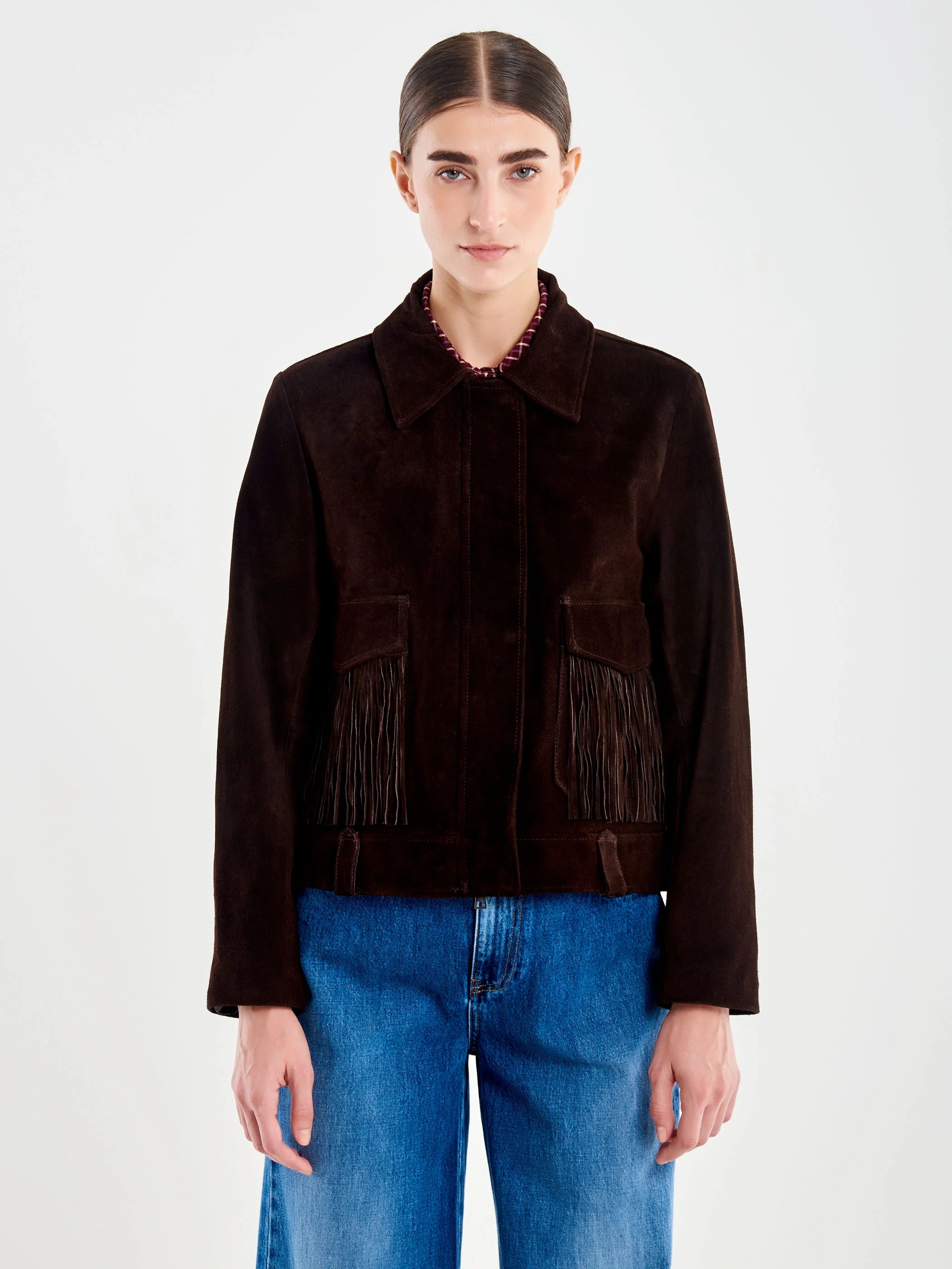 Giacca in vera pelle maniche lunghe. Tasche a pattina con frange applicate. Chiusura frontale con zip. Passanti sul fondo cintura.