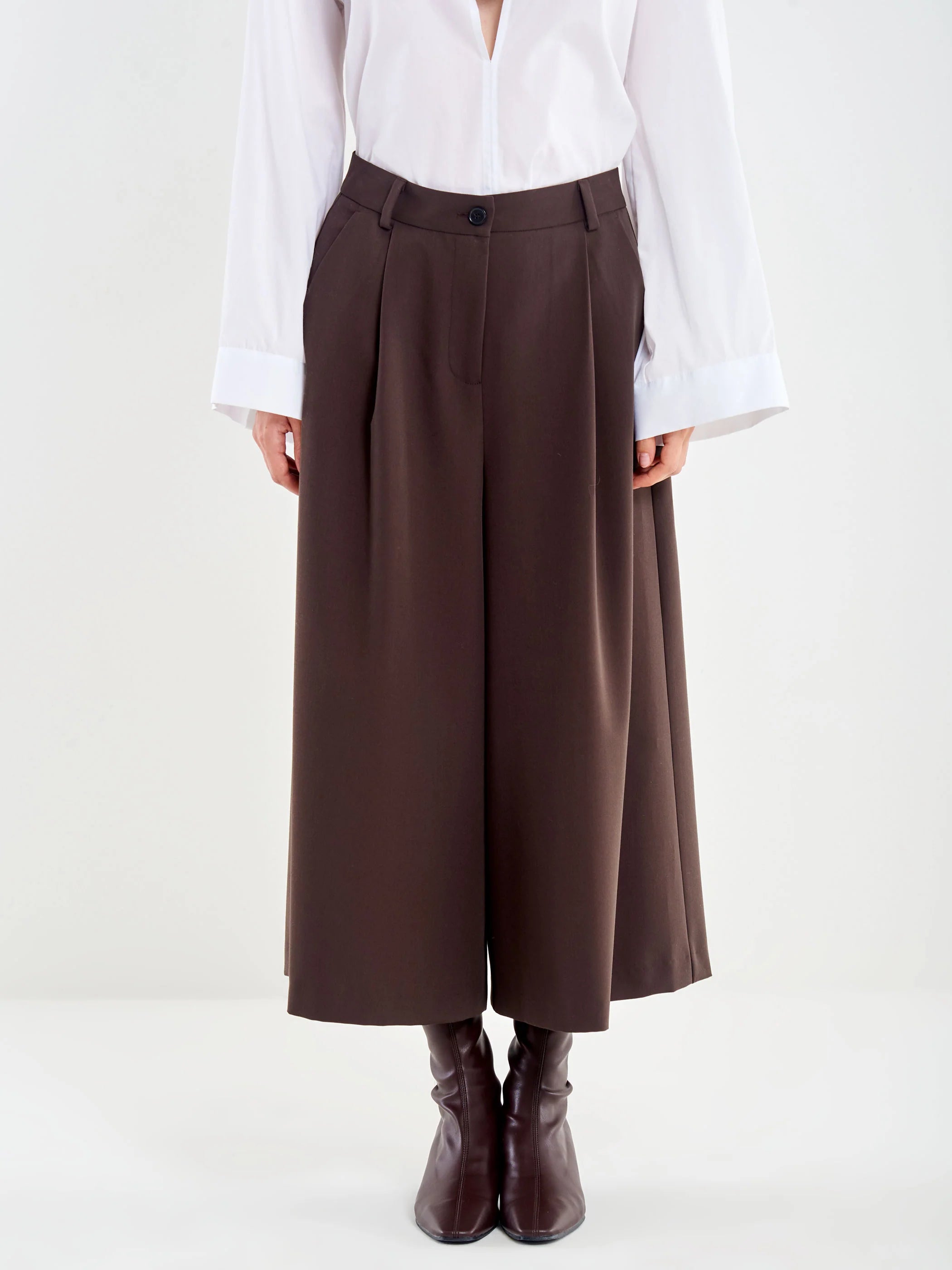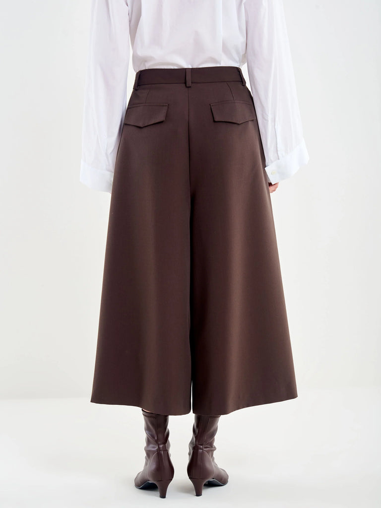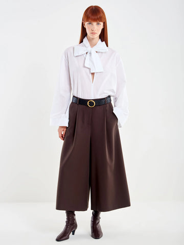 Gonna pantalone ampia con pieghe frontali. Chiusura con zip e bottone. Tasche laterali alla francese. Tasche posteriori a pattina.