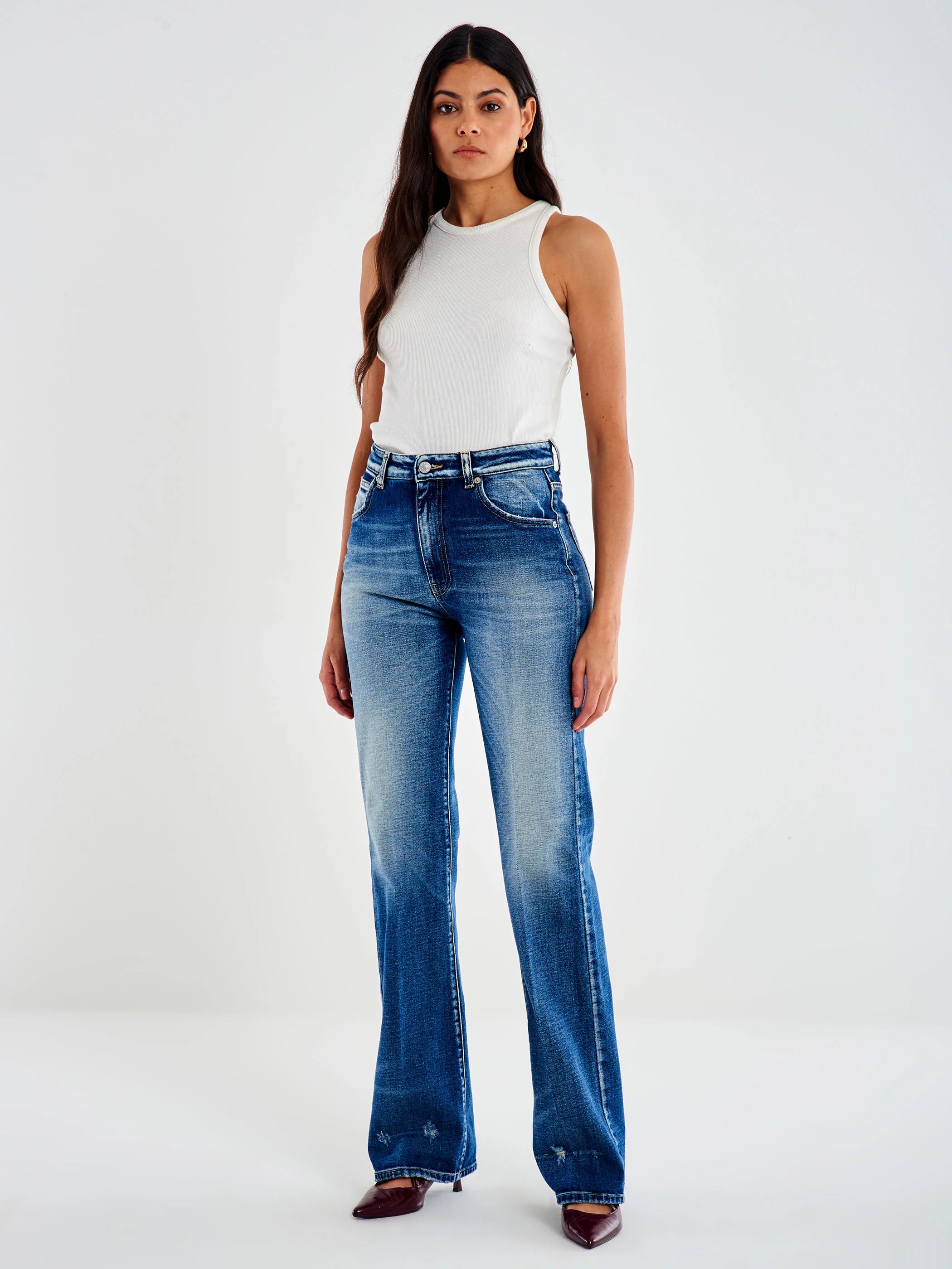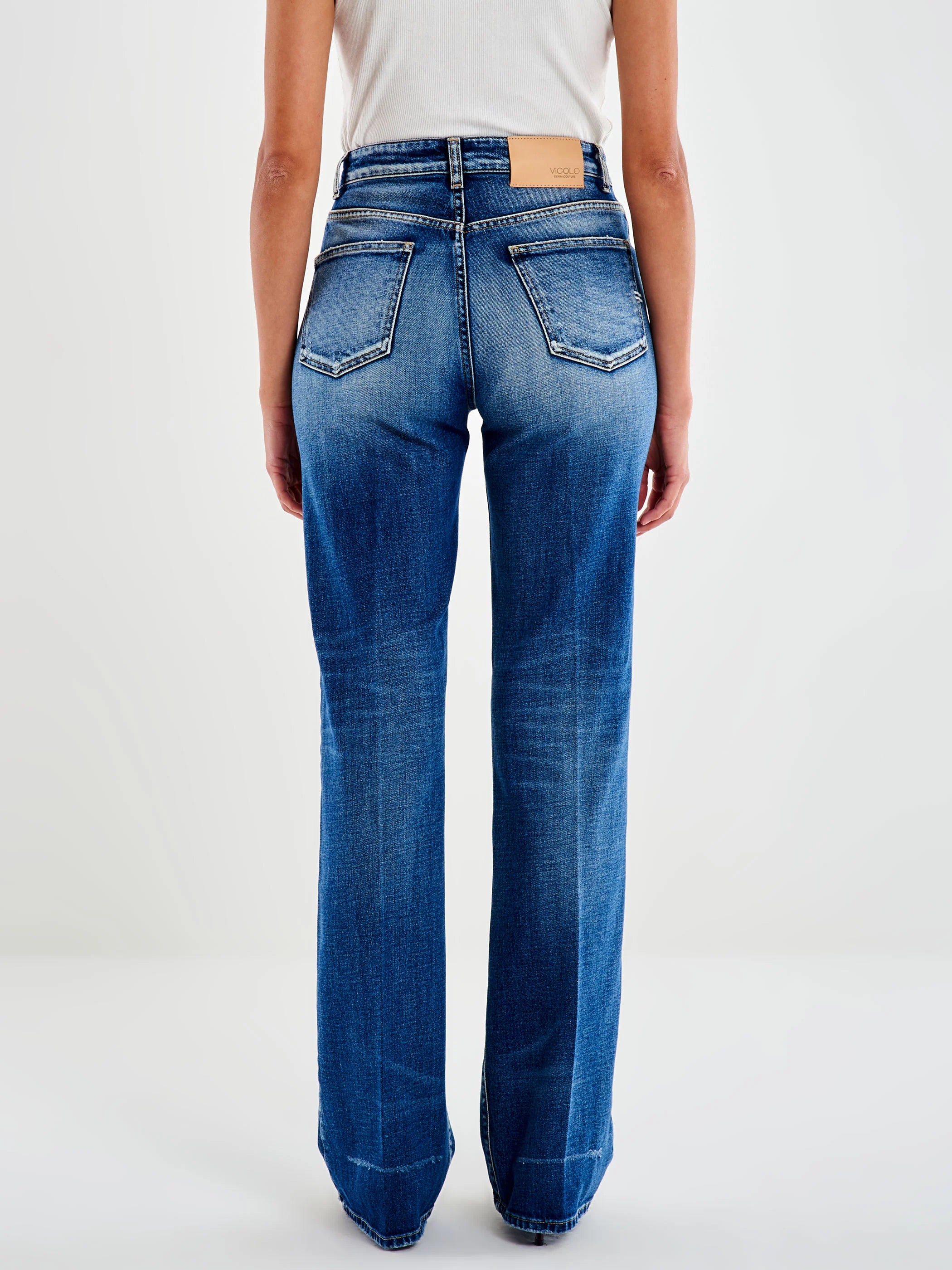Jeans Flare fit. Dettaglio modello cinque tasche. Chiusura con zip e bottone metallico. Denim sfumato con piega in stiro.
