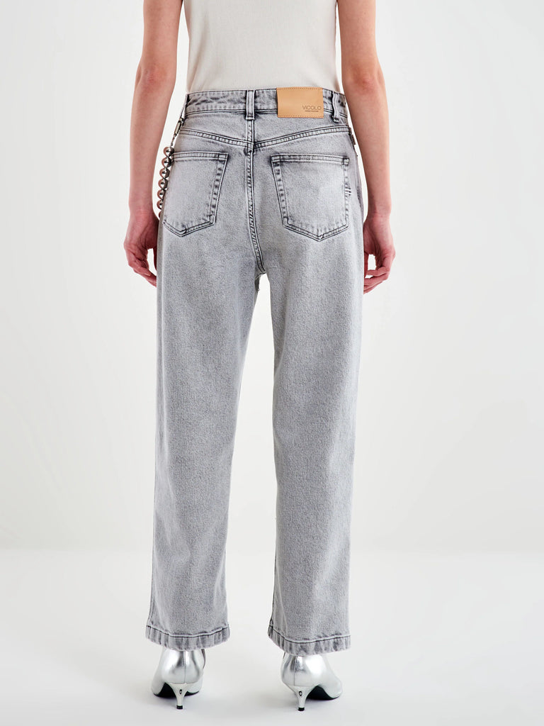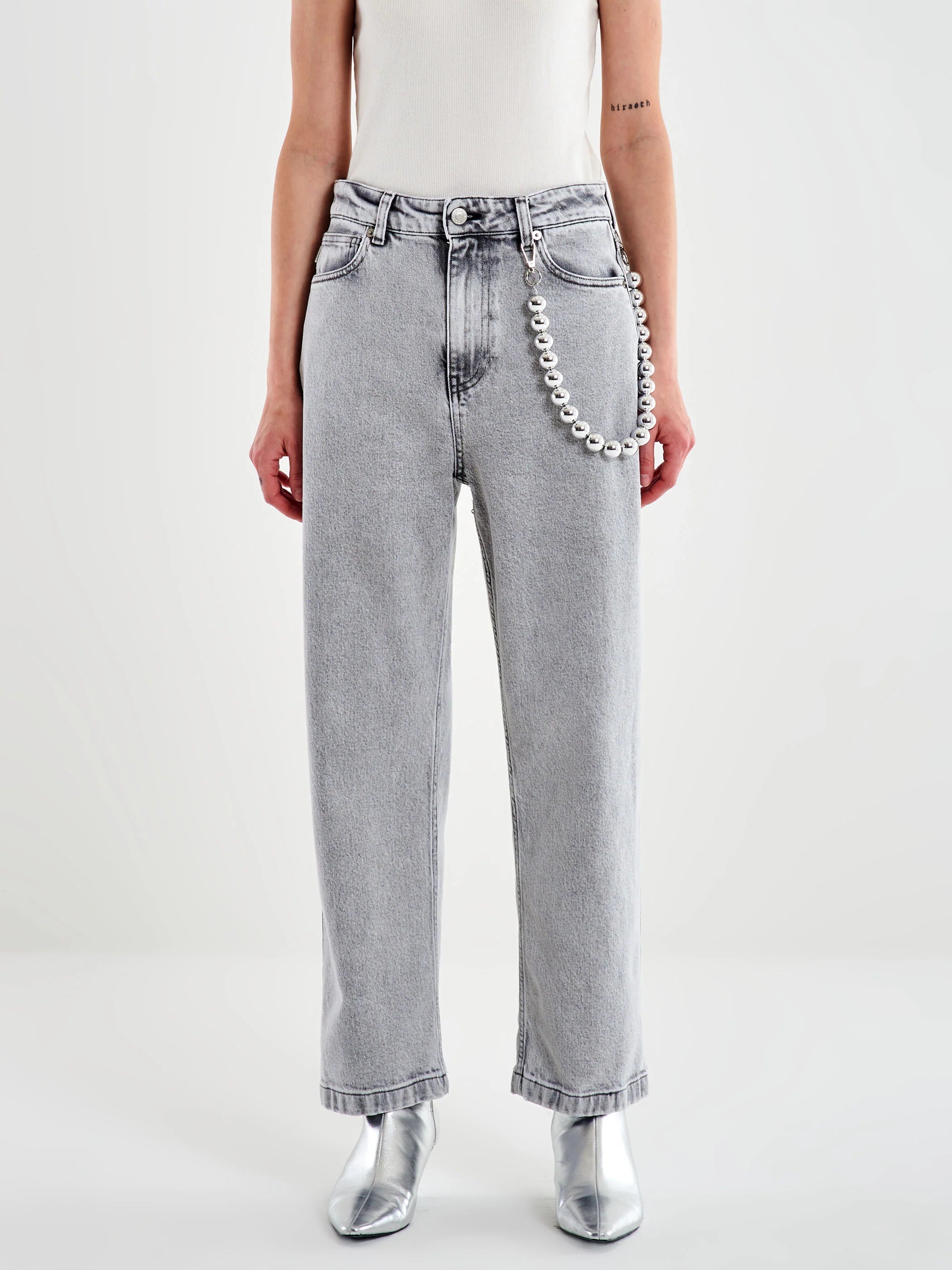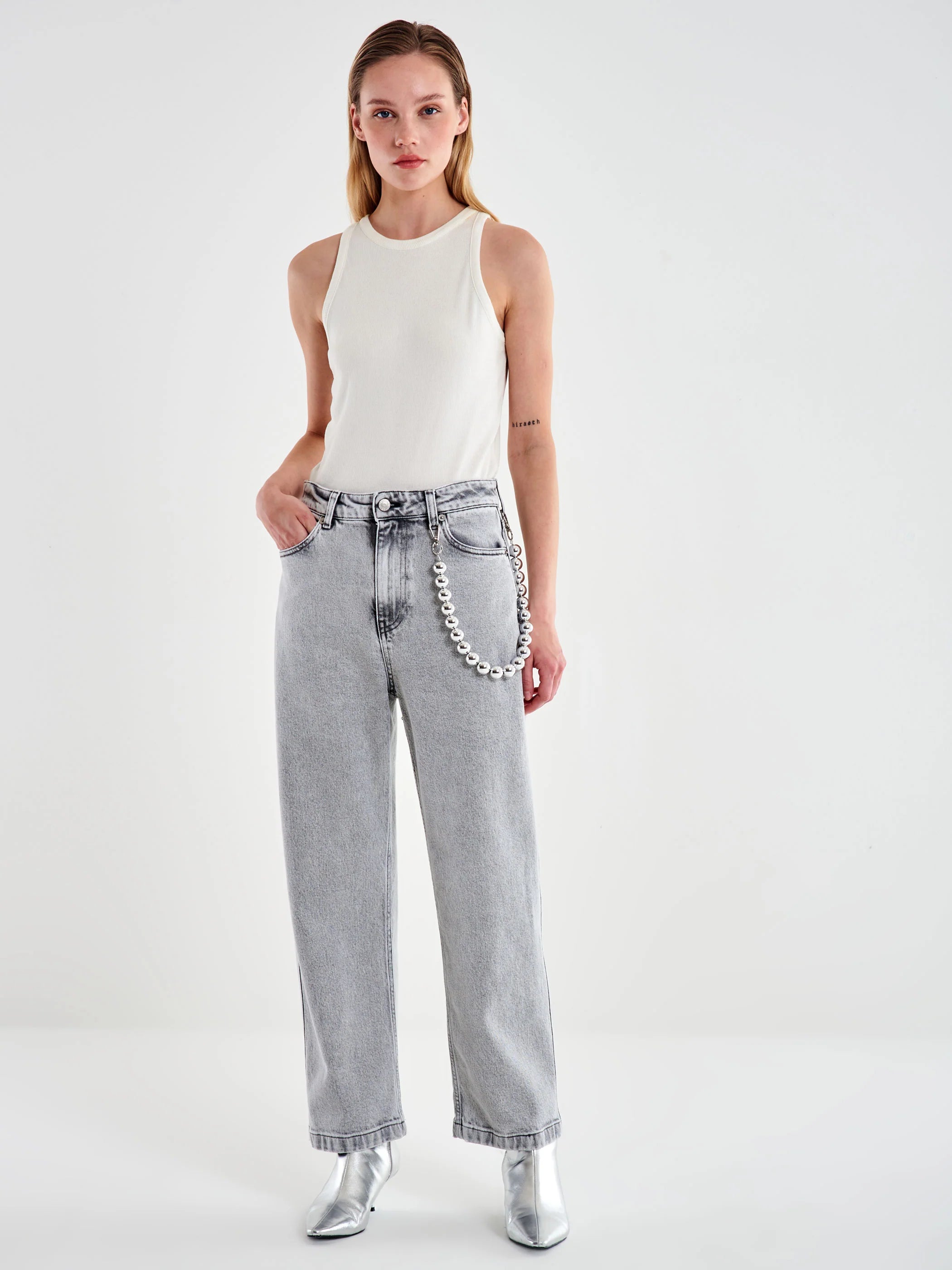 Jeans a vita alta con gamba dritta e fit morbido. Modello Icon Kate. Modello cropped. Chiusura frontale con zip e bottone. Denim grigio. Con accessorio catena in metallo agganciata sui passanti.