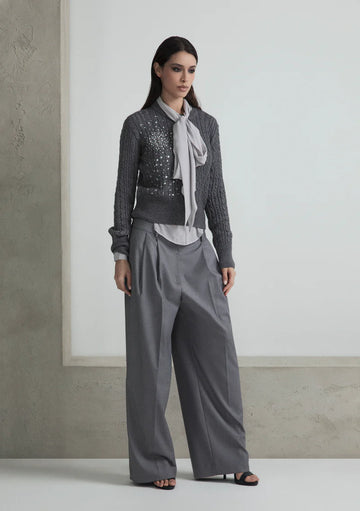 Pullover a cropped in misto cashmer. Caratterizzato da uno scollo rotondo e dalla lavorazione a treccia. Dettaglio preziosi di esplosione strass su alcuni punto del capo.