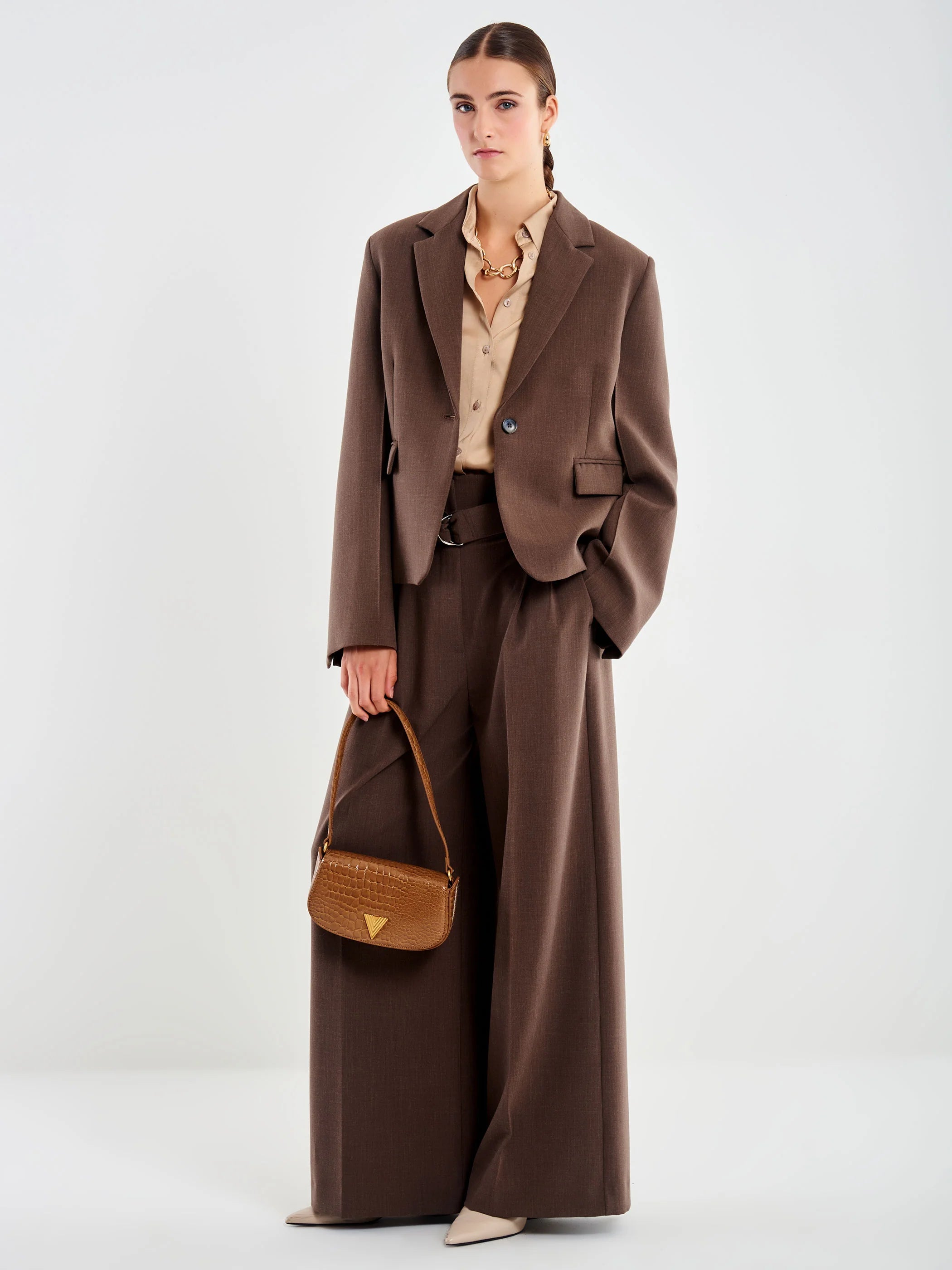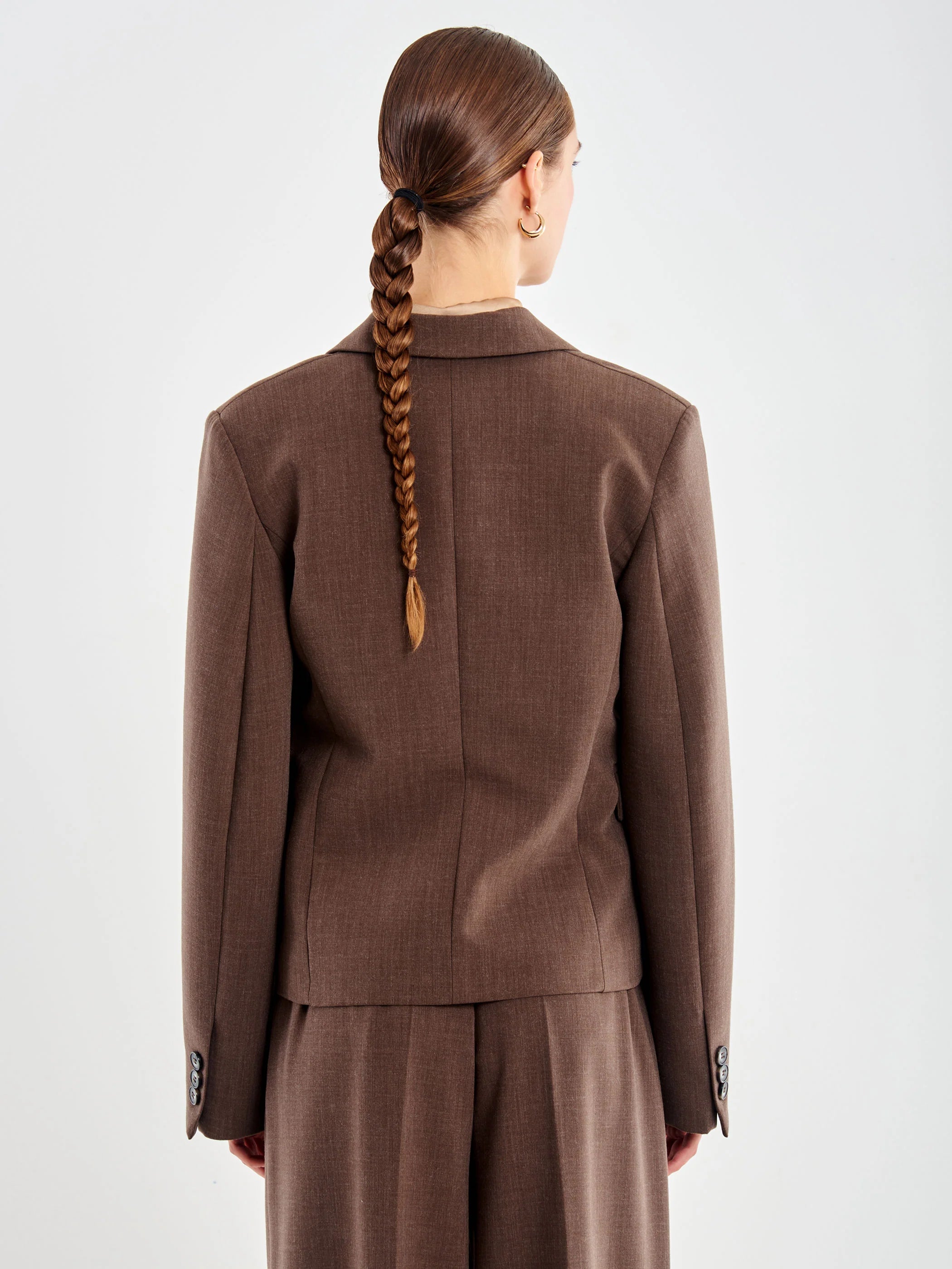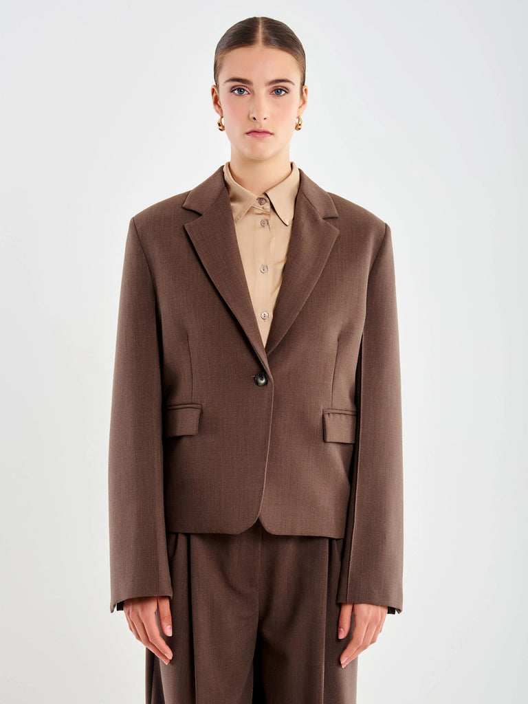 Blazer oversized cropped maniche lunghe. Dettaglio spalla ampia con nervatura cuciture manica. Chiusura monopetto con un bottone. Tasche a pattine sul fronte