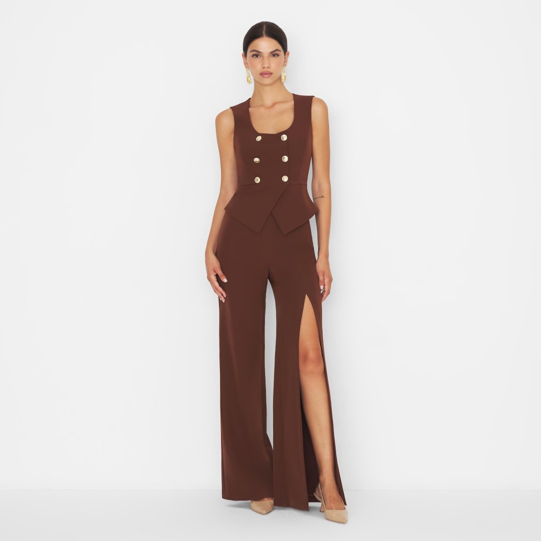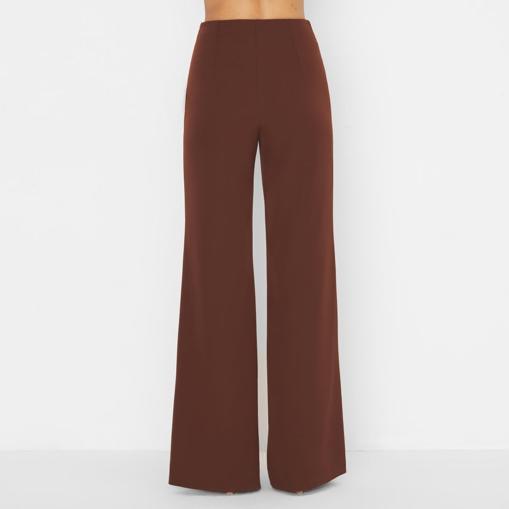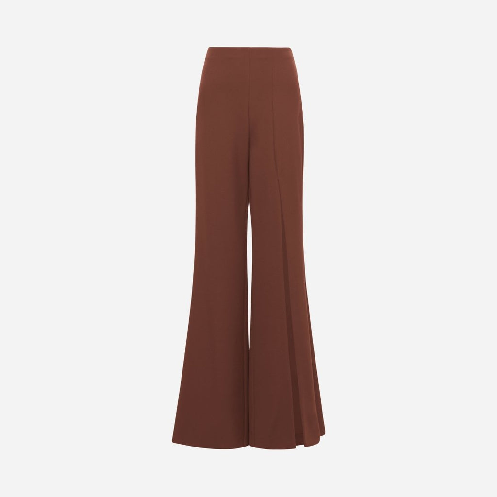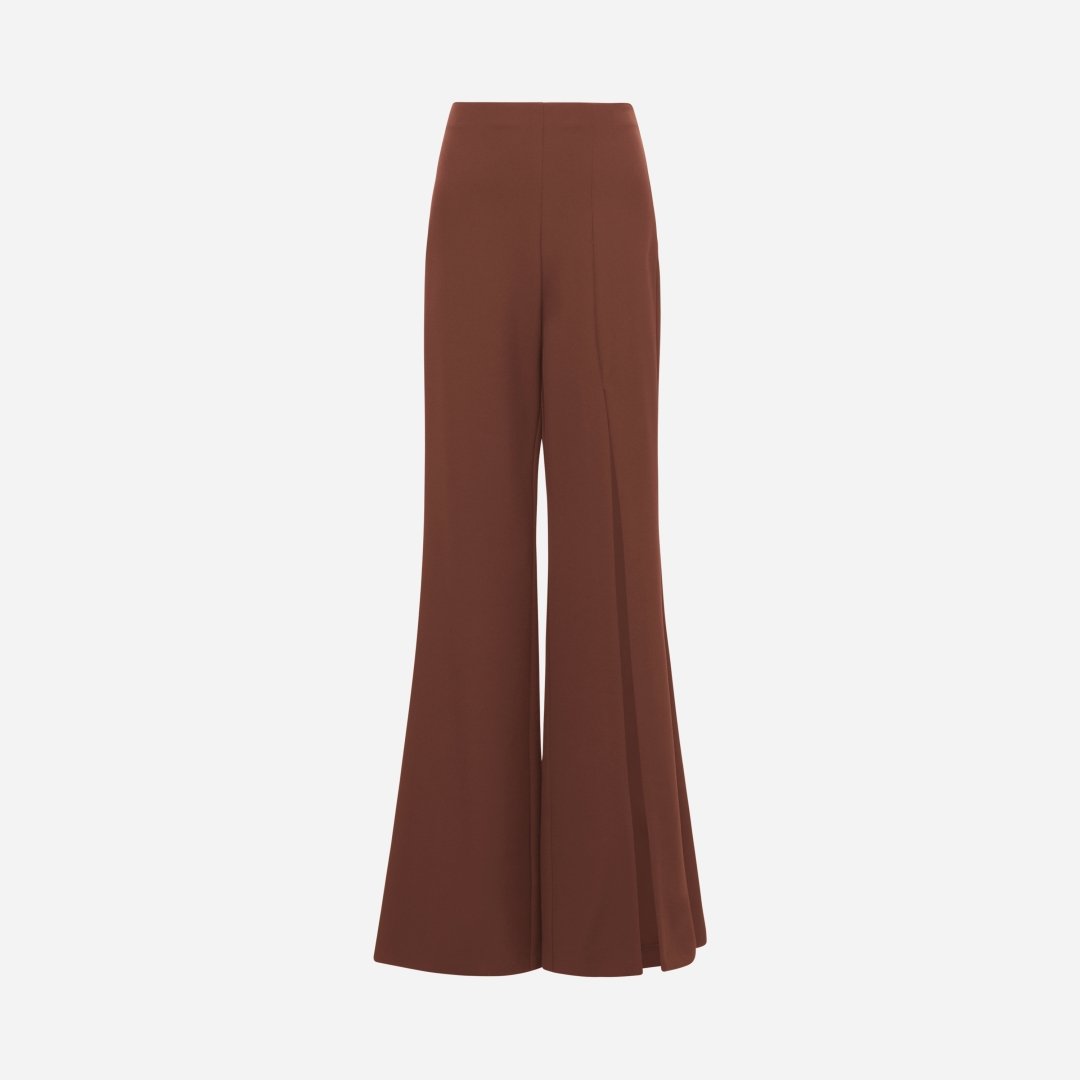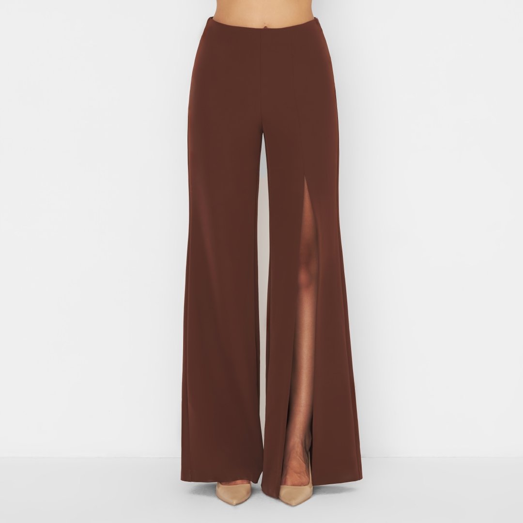 Pantaloni zampa in tessuto tecnico con ampio spacco ad una gamba. Vita alta e chiusura laterale con zip invisibile.