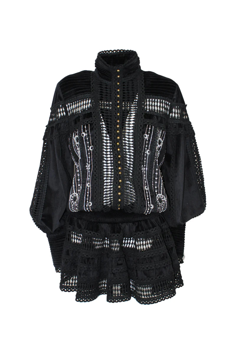 Abito corto svasato in velluto con inserti in pizzo che creano un gioco di trasparenze. Maniche lunghe a sbuffo, gonna a balze e collo coreana.
