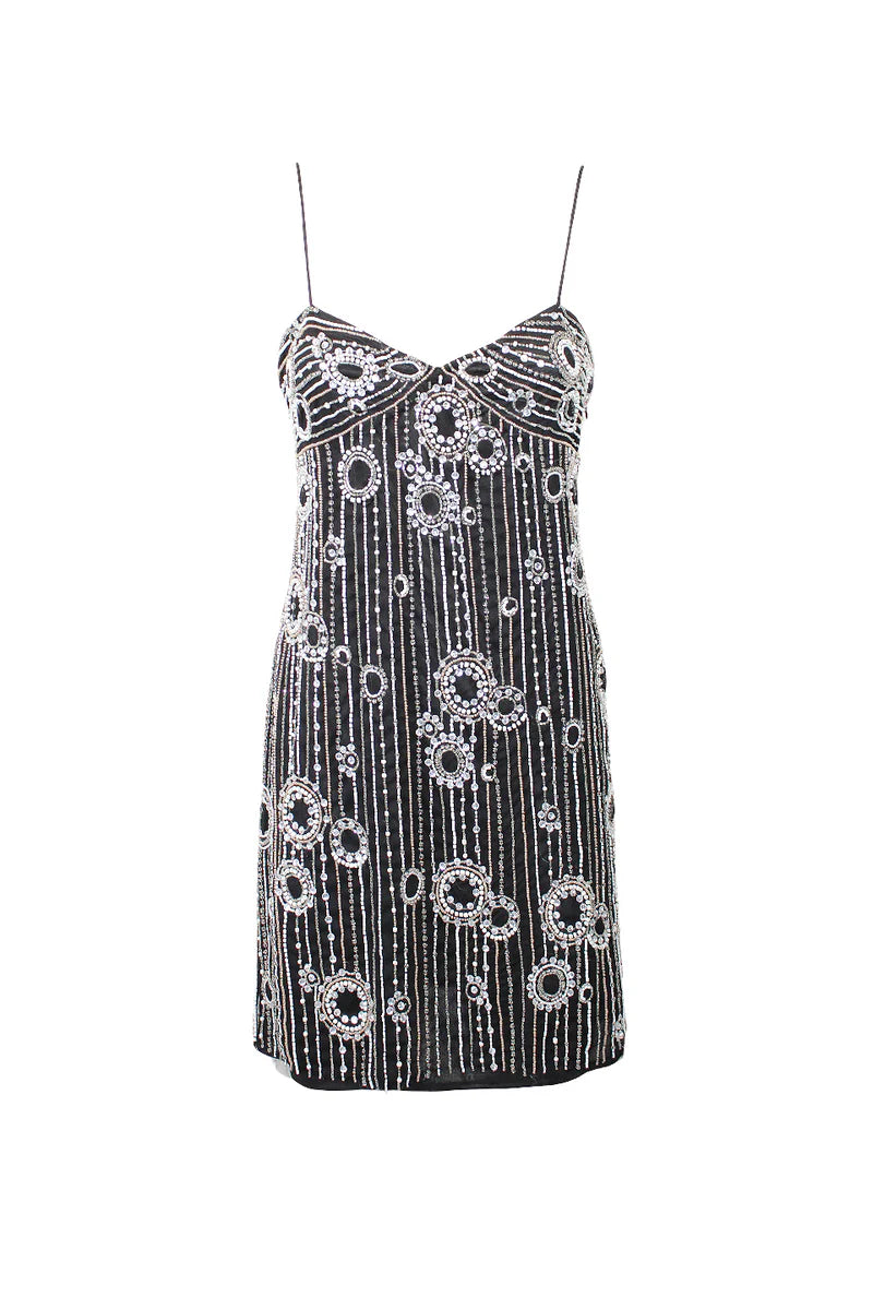 Abito corto interamente ricoperto da ricamo di perline e strass. Fodera interna di crepe in poliestere.