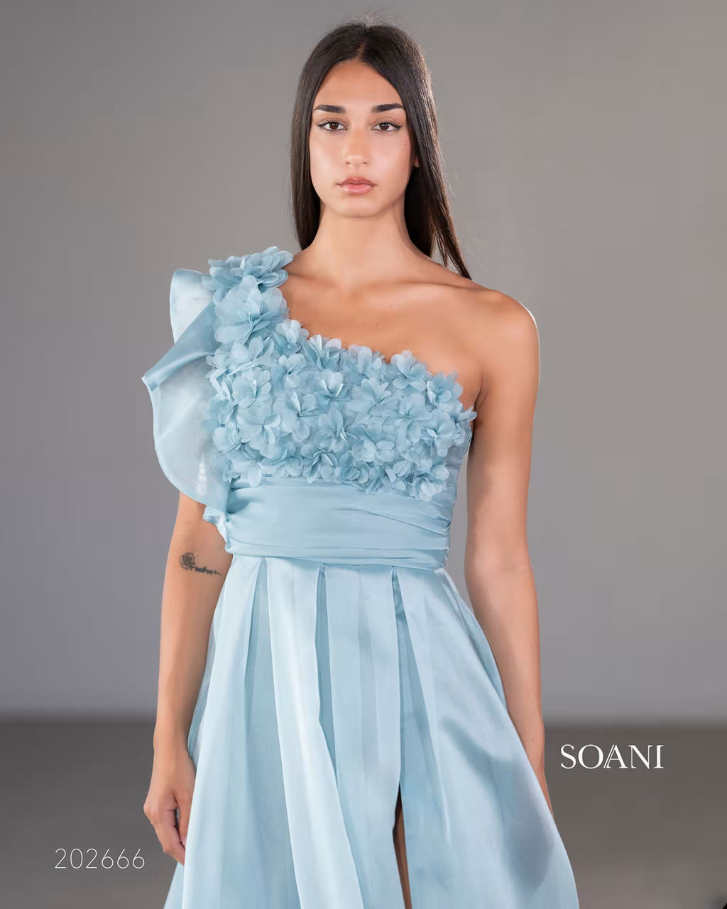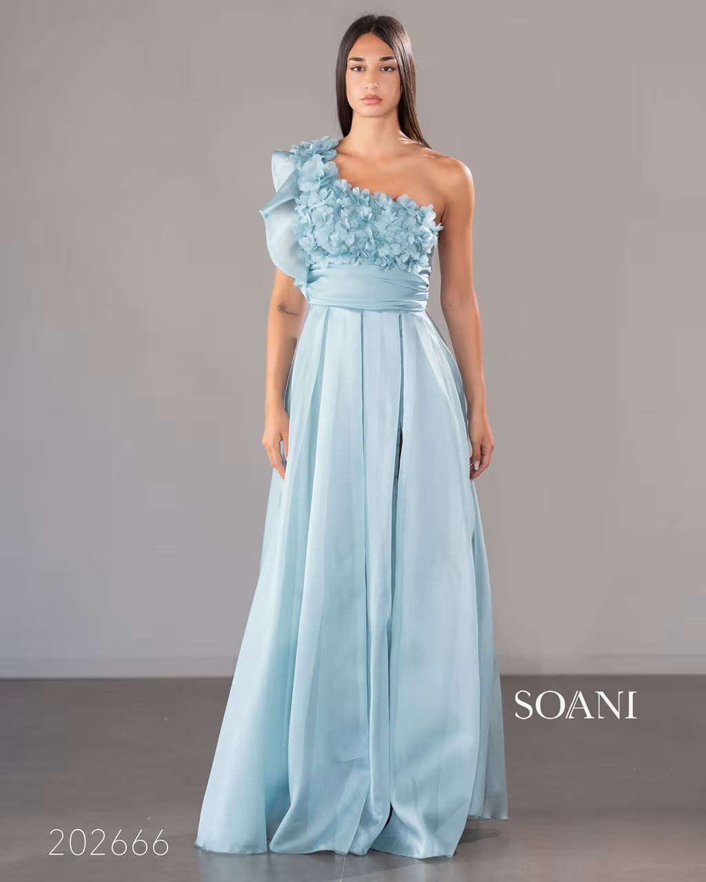 L’abito lungo con applicazioni floreali tridimensionali al davanti del top monospalla, lo stesso che presenta un'ampia rouche.