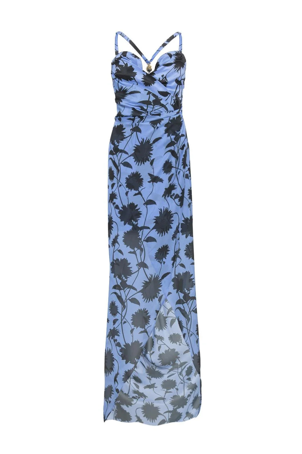 Abito lungo in duchesse stampato. Pannello in georgette drappeggiato, spacco e bretelle removibili.