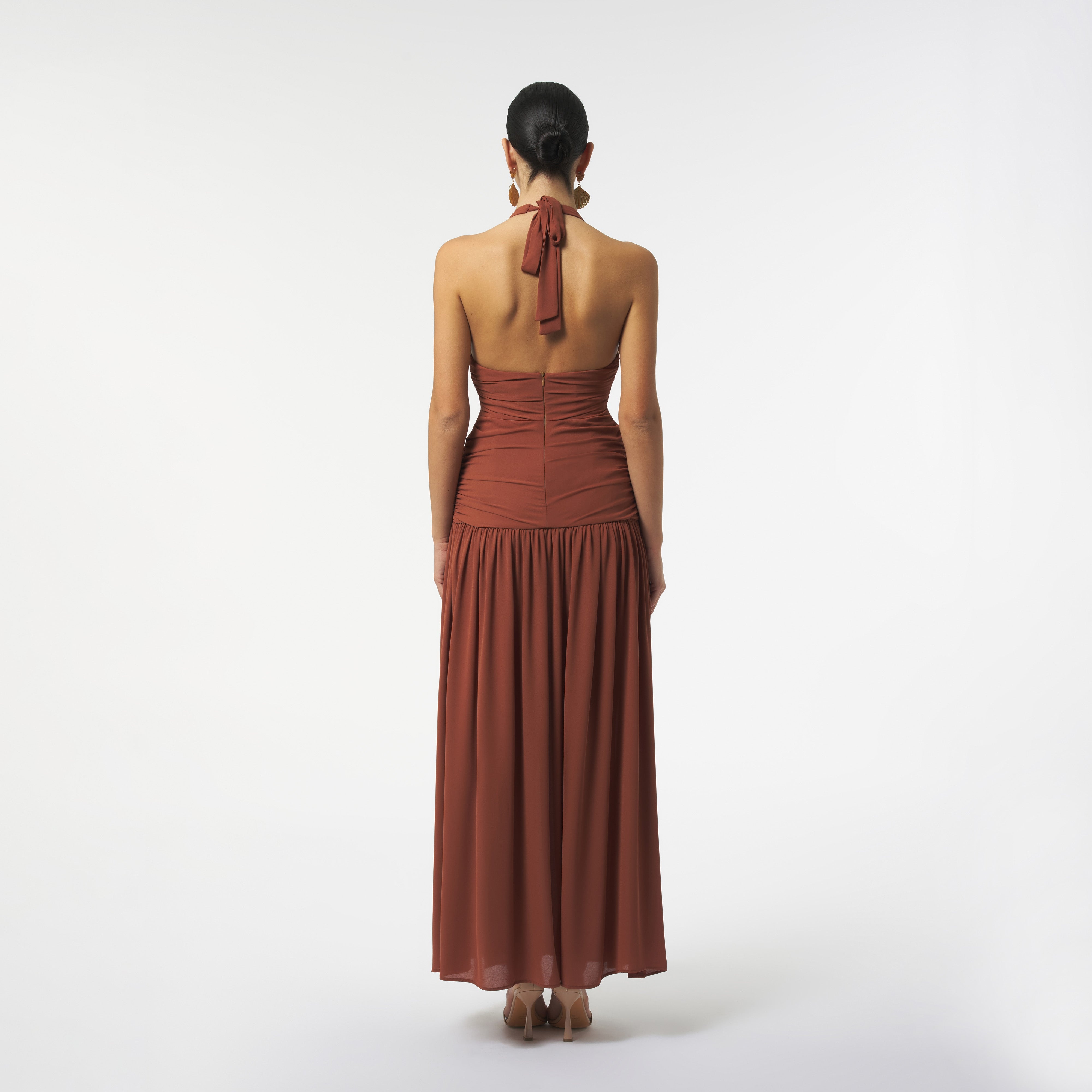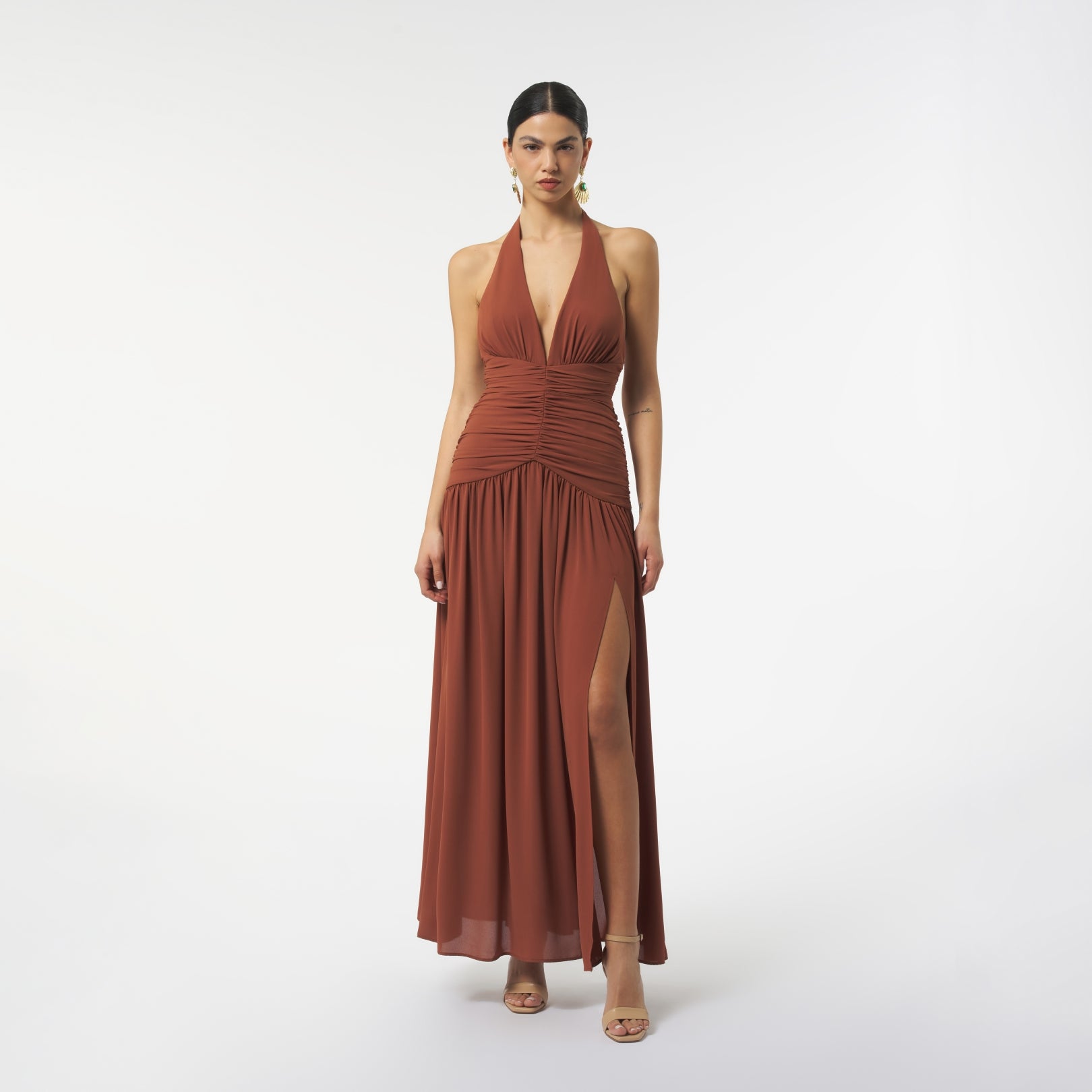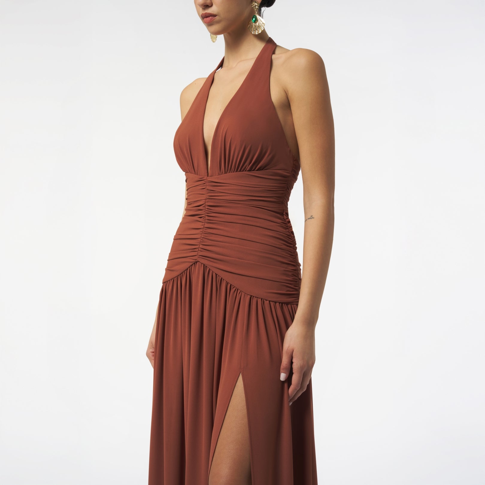 Abito lungo in chiffon con profondo scollo a V ed allacciatura halter che incornicia il decolletè e lascia la schiena nude. Bustino drappeggiato che definisce il punto vita ed accompagna armoniosamente le forme creando un effetto modellante e slanciante. Gonna lunga e fluida con spacco laterale.