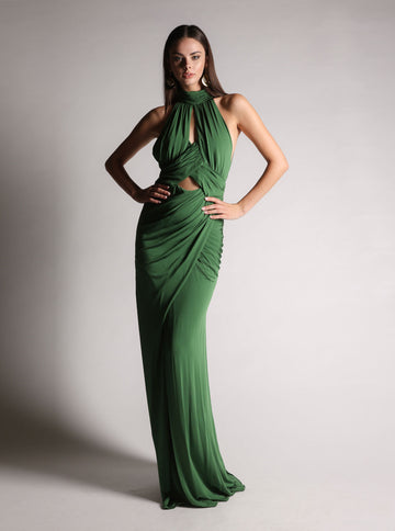 abito lungo in lycra modello sirena. Scollo americana con cut our al decolletè ed all'addome,schiena nude. Completamente caratterizzato da un gioco di arricciature e spacco accavallato.