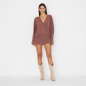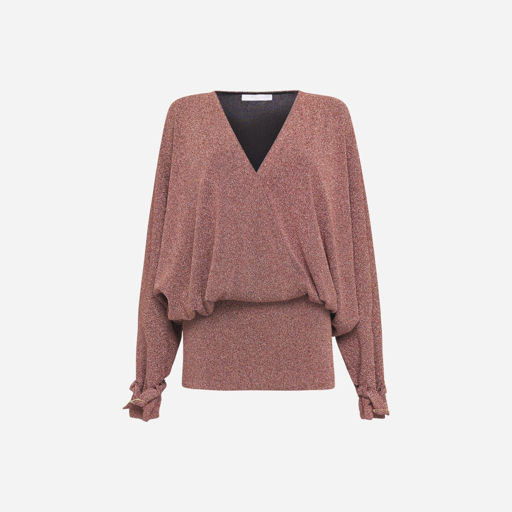 Mini dress in lurex elastico con profondo scollo a V. La vestibilità morbida del sopra contrasta con quella ederente sui fianchi. Polsini regolabili.