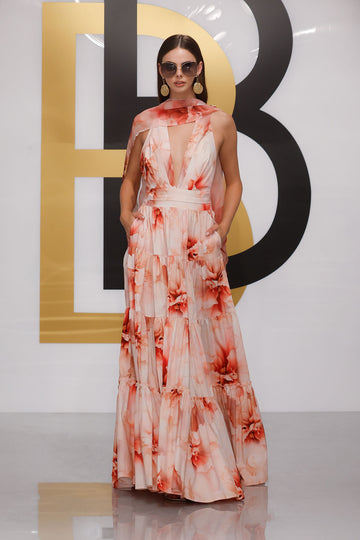 Abito lungo in cotone fantasia. Scollatura profonda, fasciato in vita e gonnellone a balze con tasche a filo. Fiocco che si annoda al collo e schiena completamente nude.