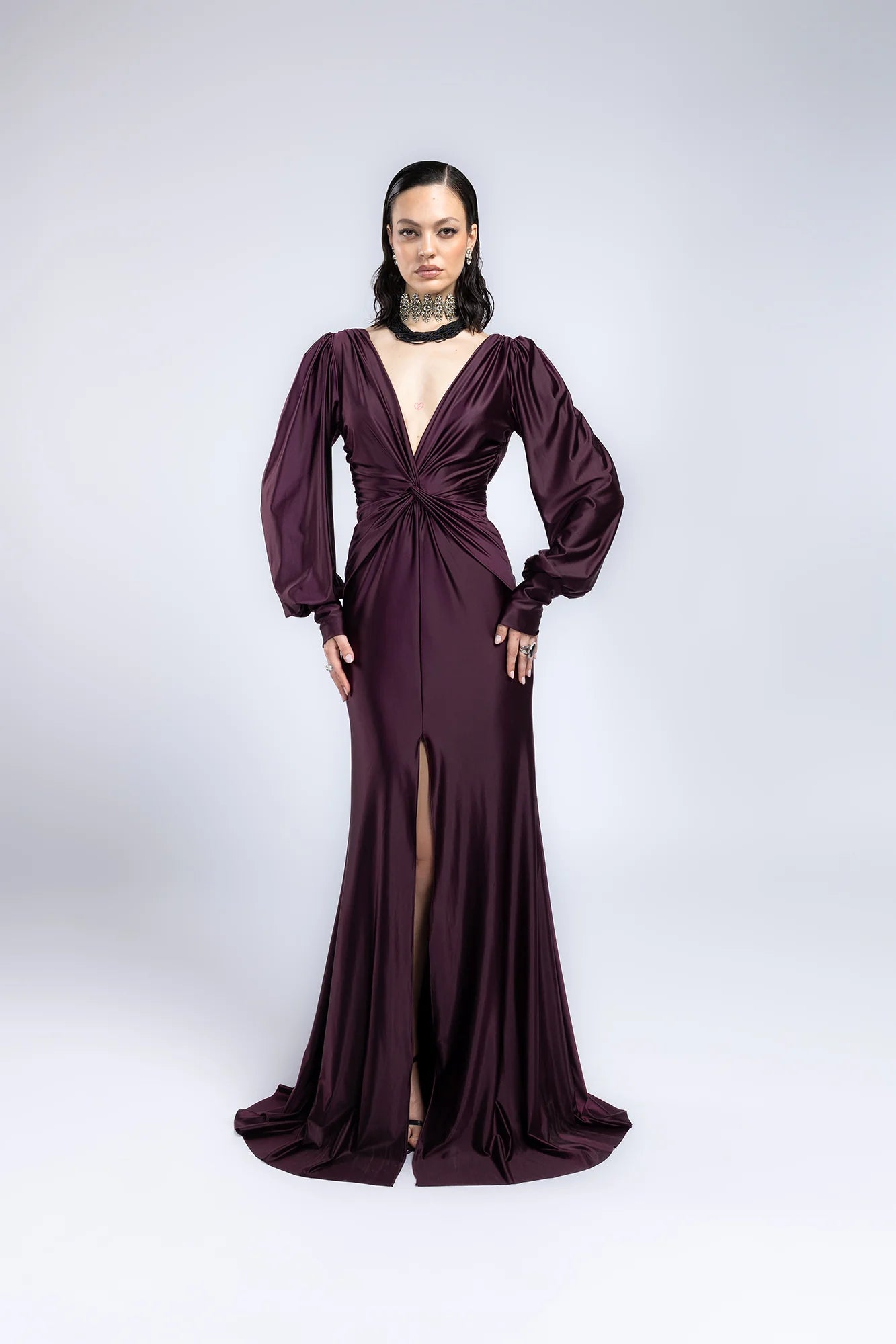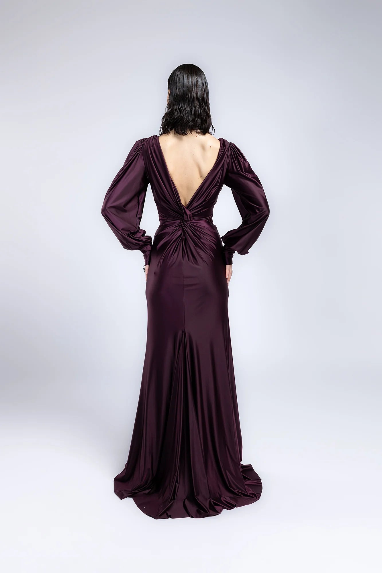 Abito lungo in jersey dalla linea avvolgente. Maniche ampie che creano volume grazie al polsino aderente. Profondo scollo a V sia al decolletè che alla schiena.