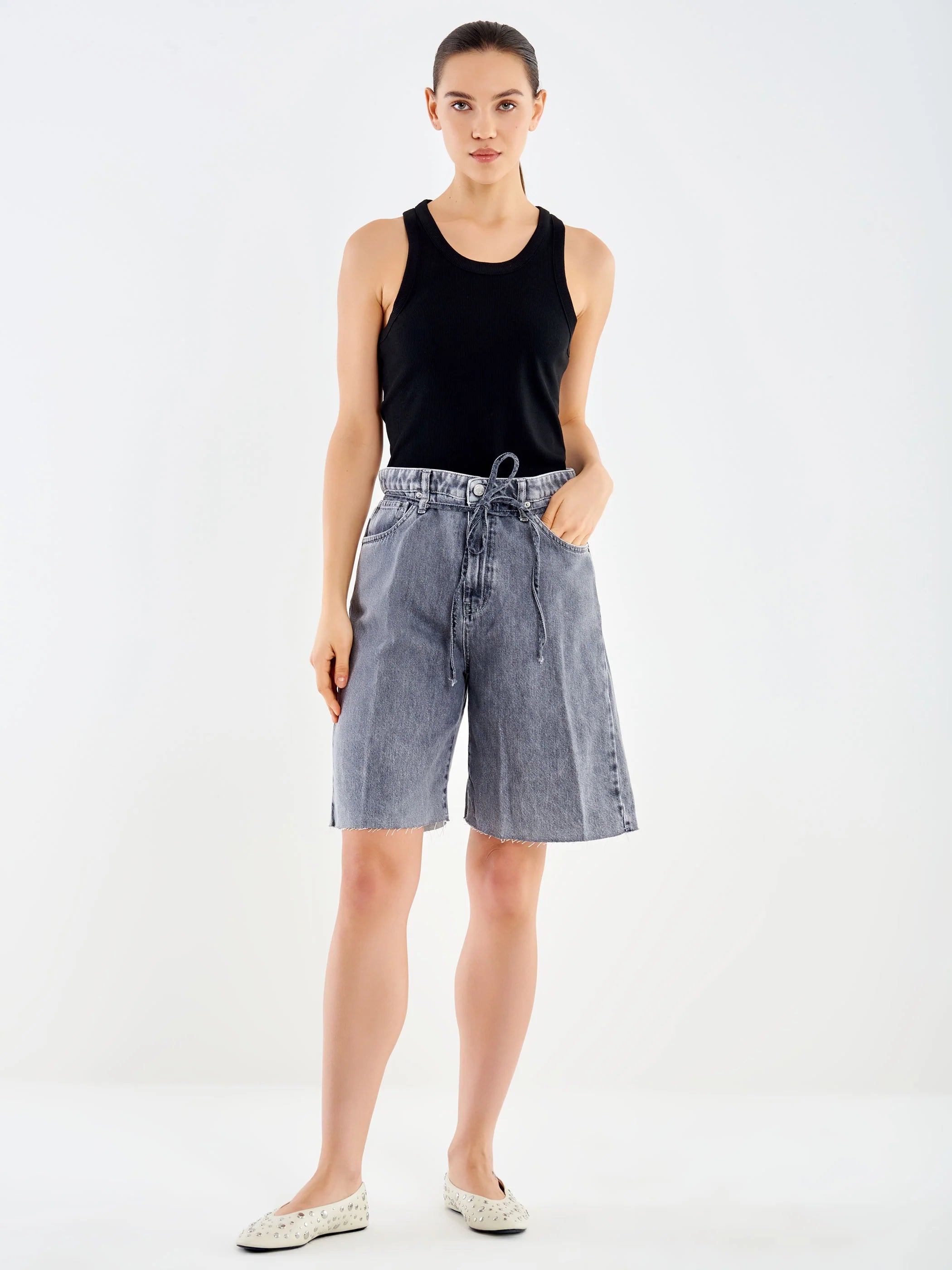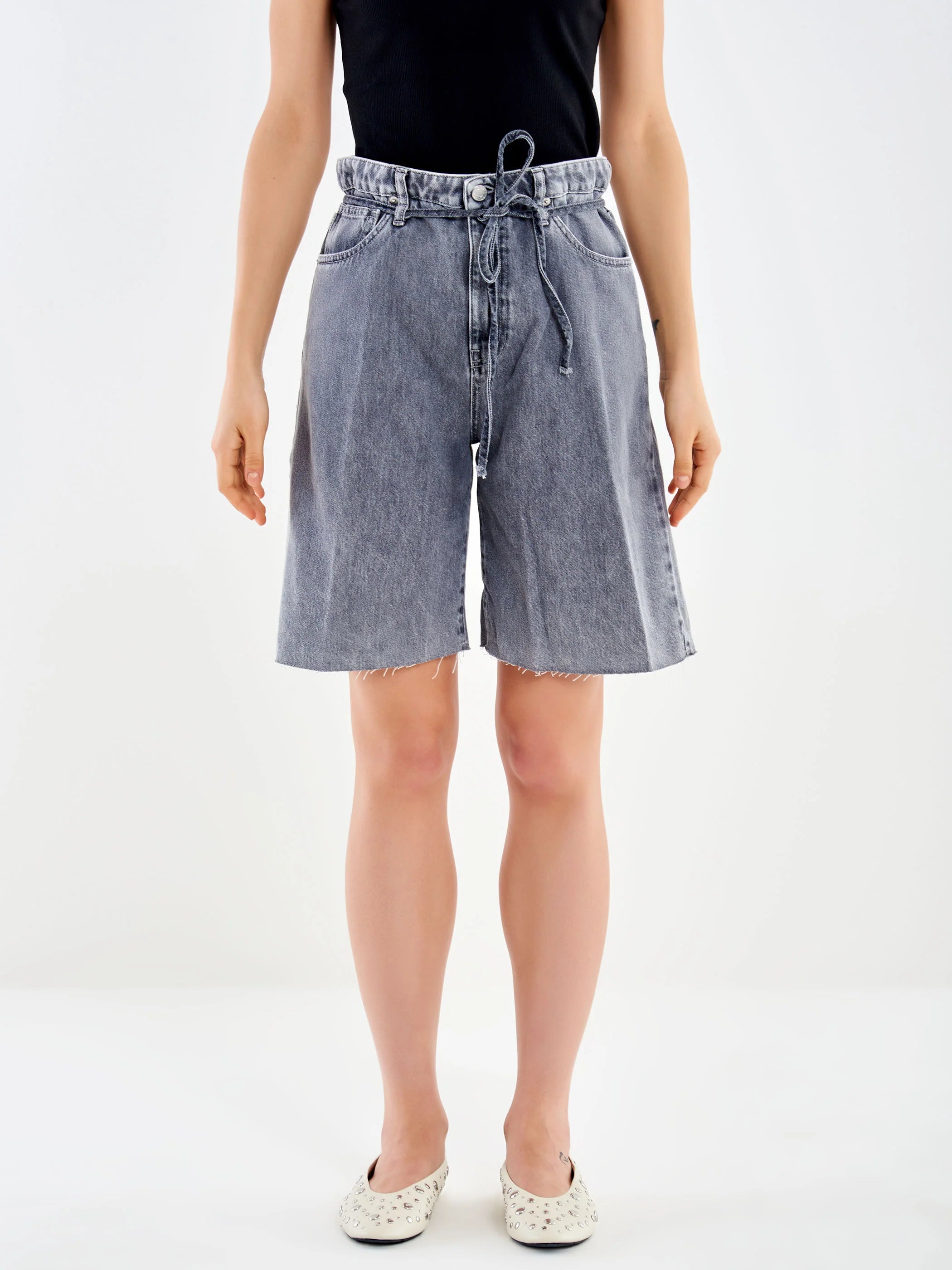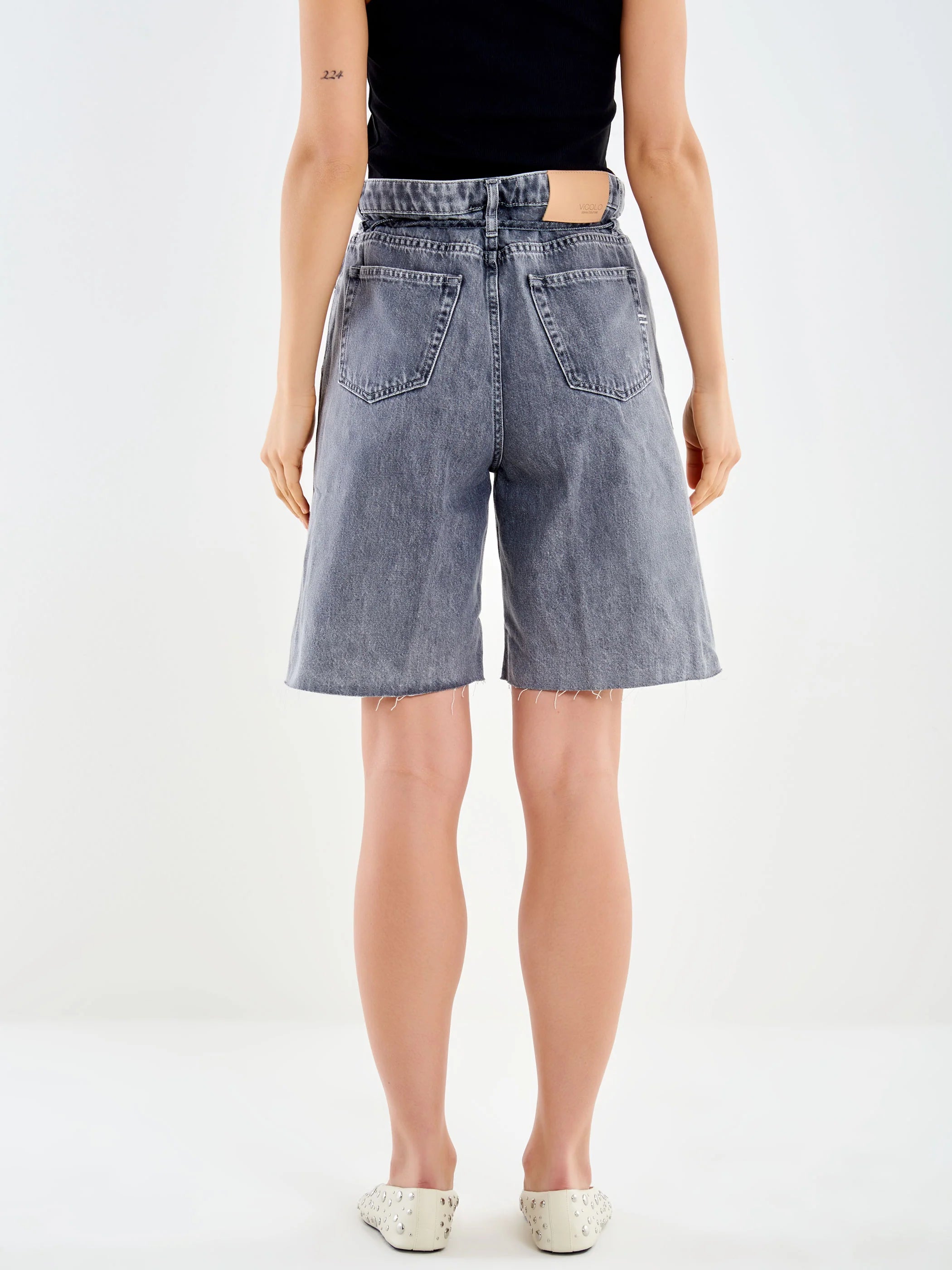 Bermuda in denim modello cinque tasche. Chiusura con zip e bottone. Bordo inferiore taglio vivo. Denim grigio sfumato.