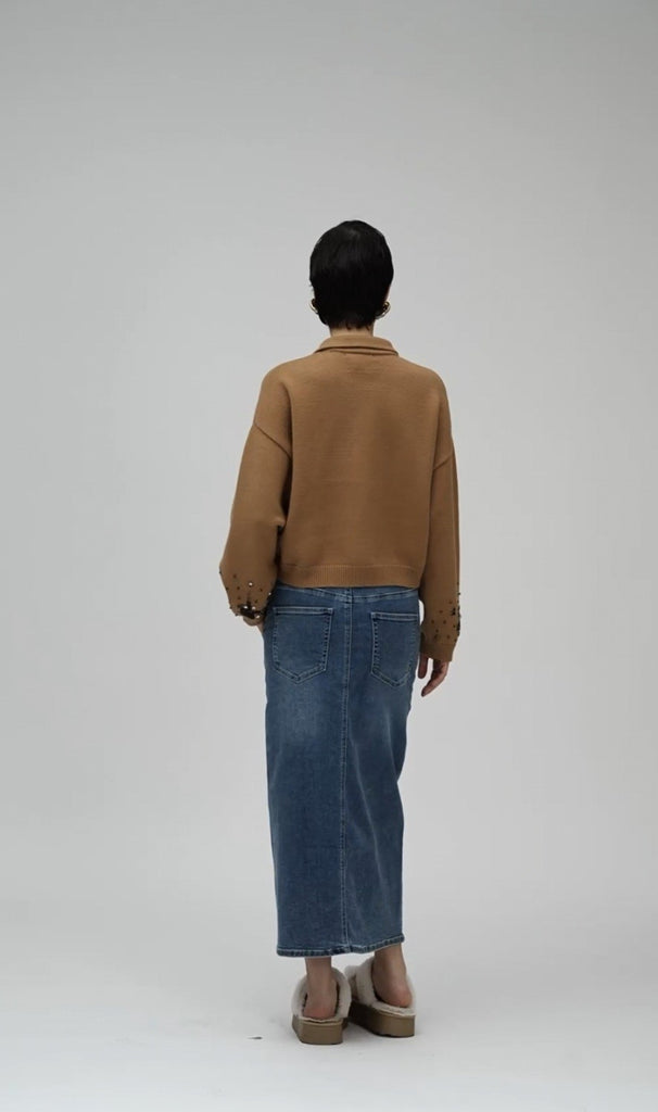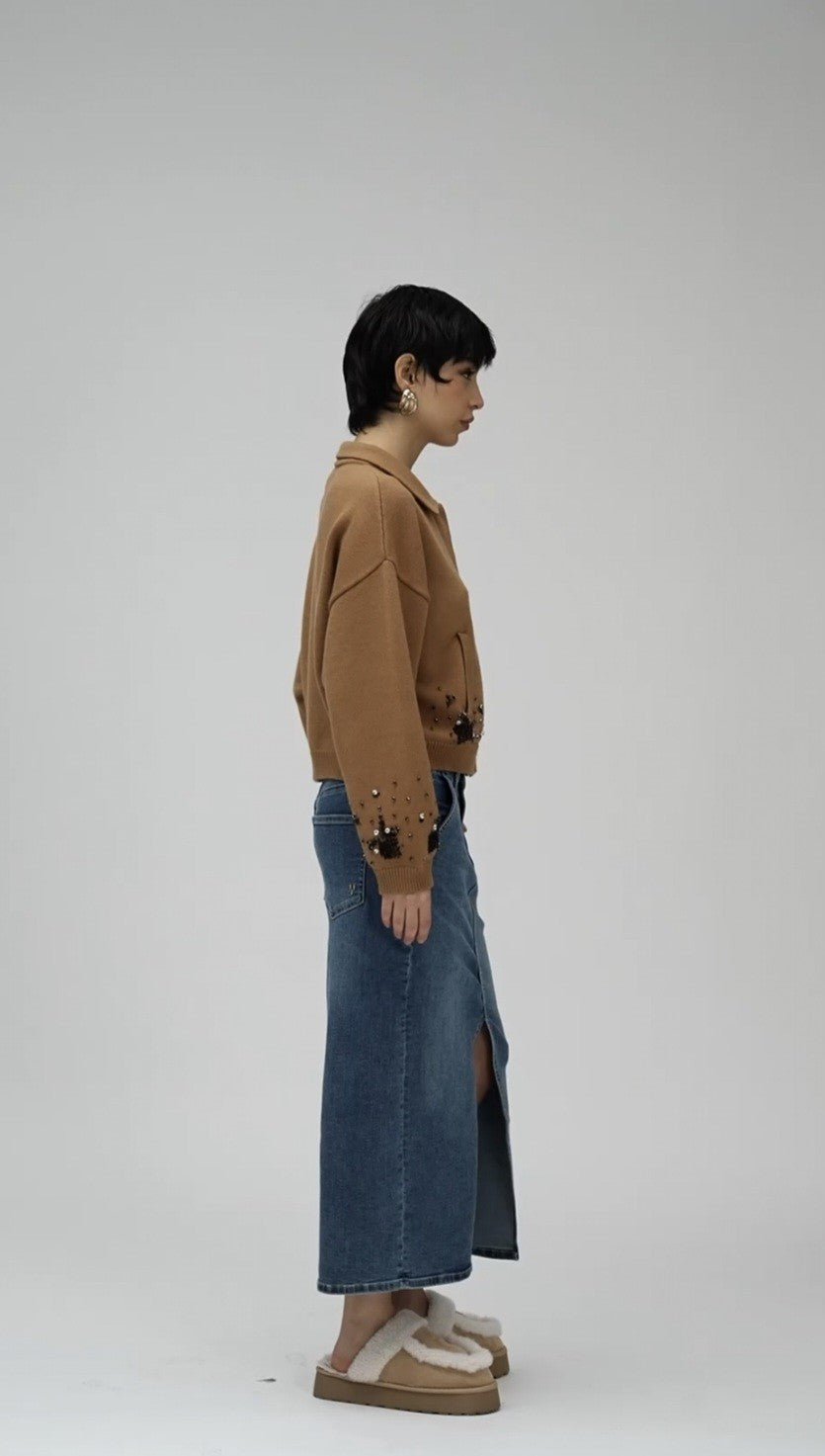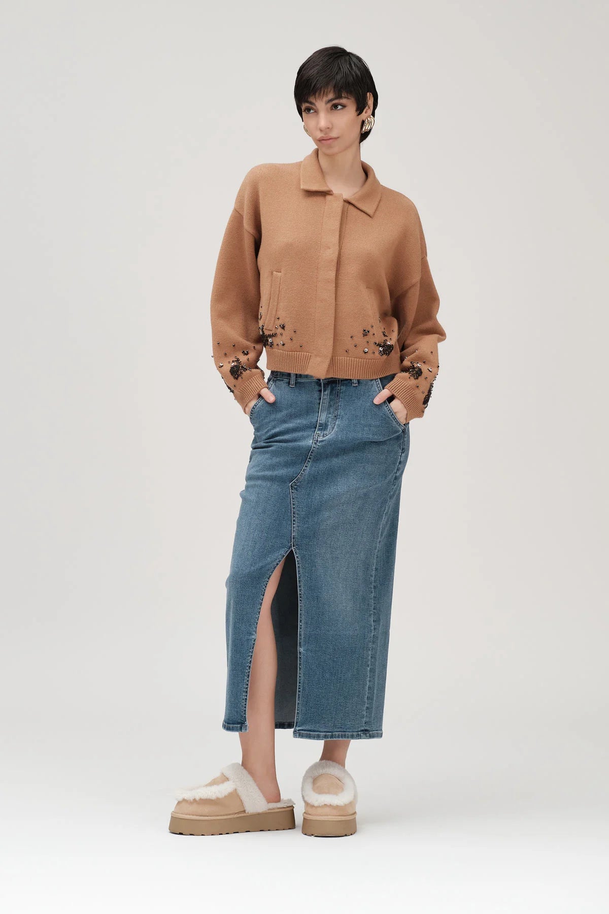 Bomber in maglia con applicazioni. Collo a polo, tasche anteriori trasversali ed abbottonatura nascosta.