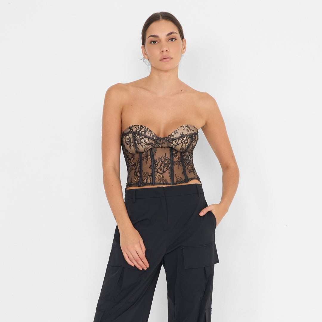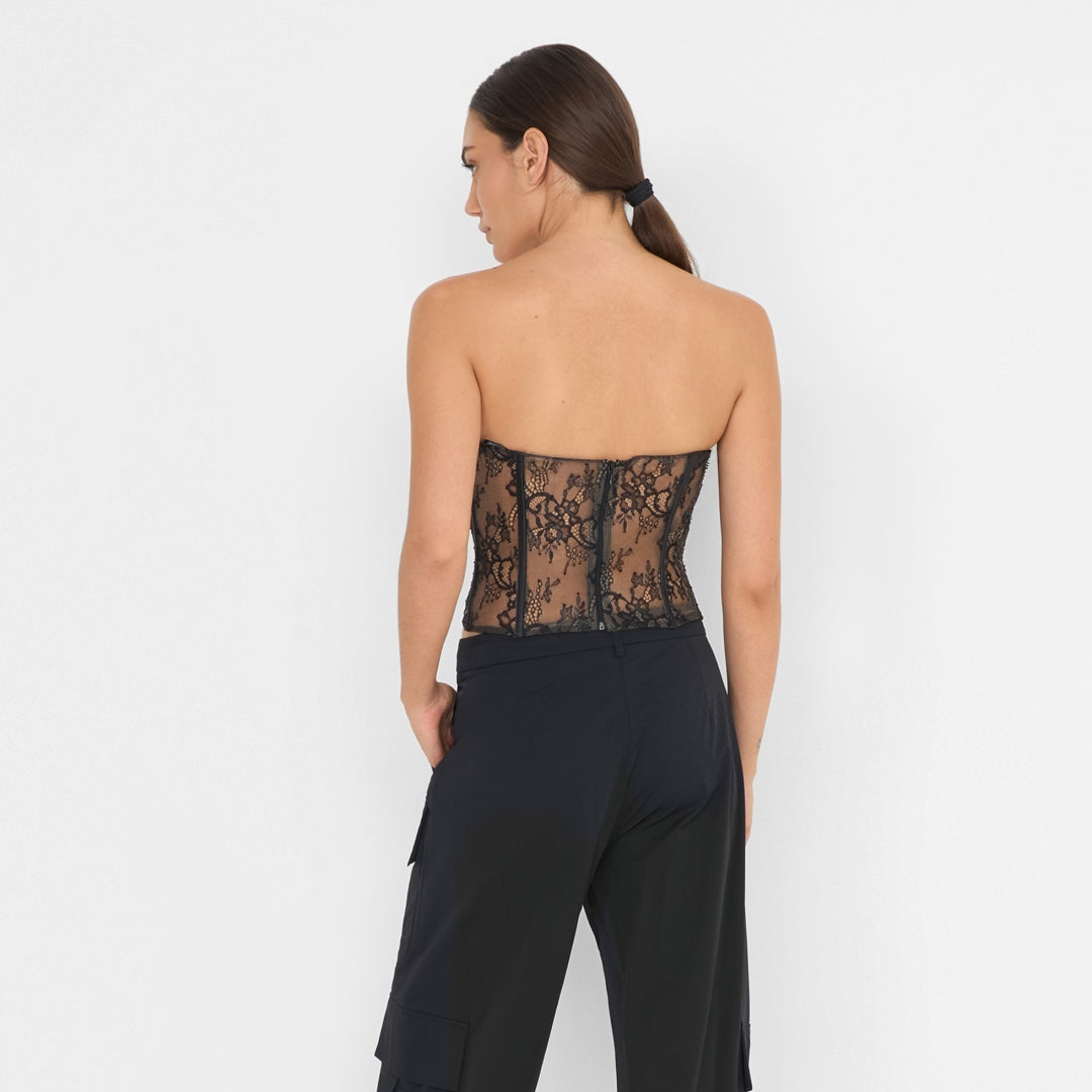 Bustier in pizzo con ricamo dal motivo floreale. Coppe a balconcino imbottite, stecche e chiusura con zip invisibile sul retro.