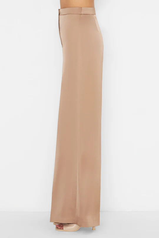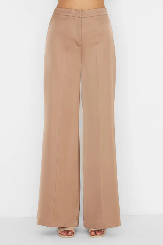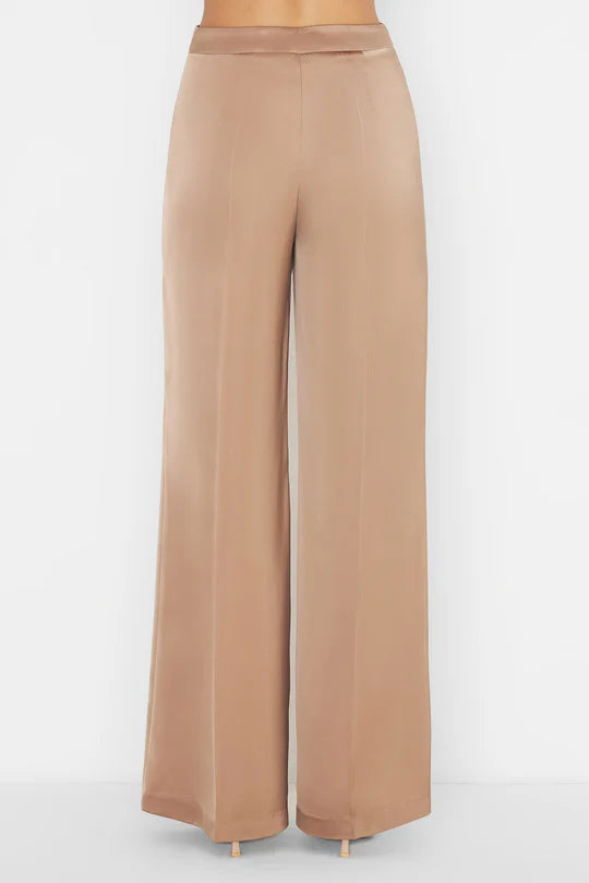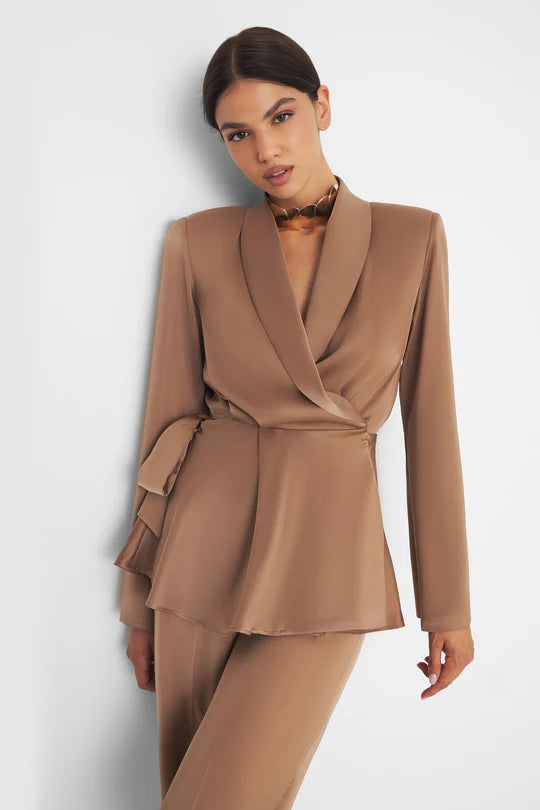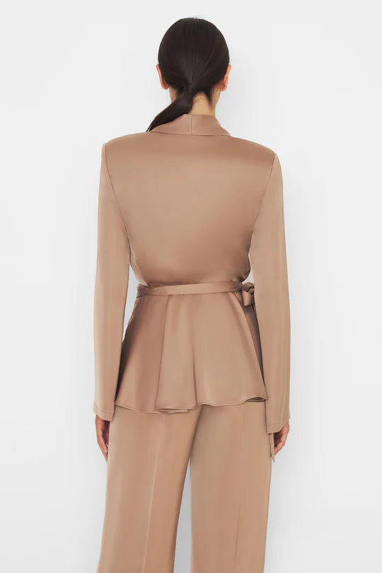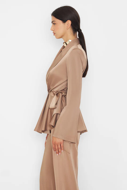 Coordinato in raso con giacca modello kimono caratterizzata da in vita regolabile e collo tondo. I pantaloni palazzo presentano vita stretta ed alta