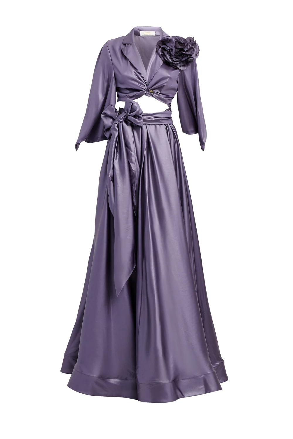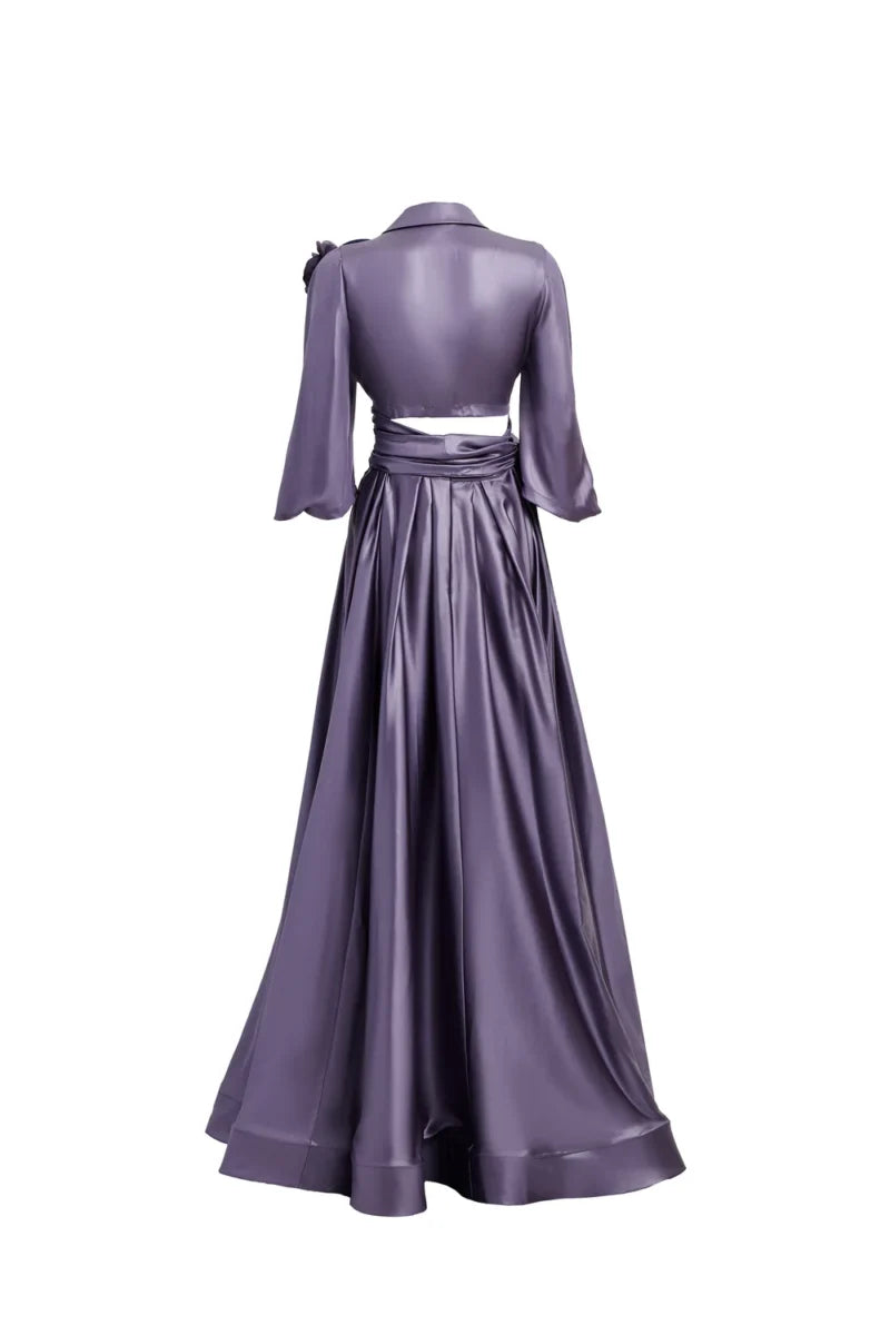 Completo in taffettà composto da camicia con collo revers al quale applicare un'ampia spilla a fiori e nodo drappeggiato centrale che valorizza il punto vita, mentre la gonna dal volume ampio e strutturato con vita alta e fasciata è valorizzata da un fiocco scenografico.