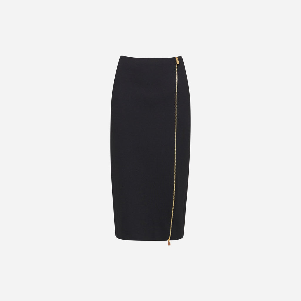 Gonna midi vita alta in tessuto tecnico. La zip dorata a vista permette di regolare l'ampiezza dello spacco. Vestibilità aderente.