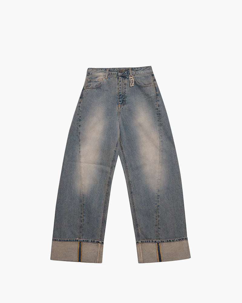 Jeans 5 tasche a gamba larga con cucitura trasversale. Maxi risvolto con cucitura a contrasto