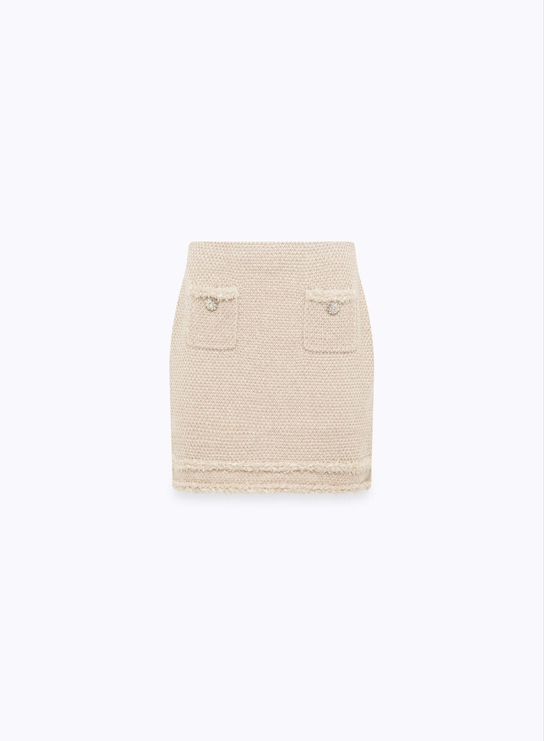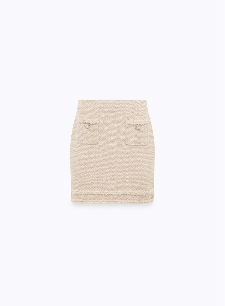 Minigonna in maglia moulinè effetto tweed. Profili bicolore sfrangiati e bottoni gioiello. Modello boxy con colletto.