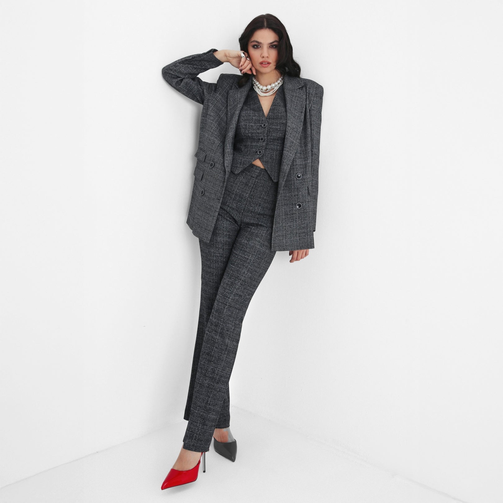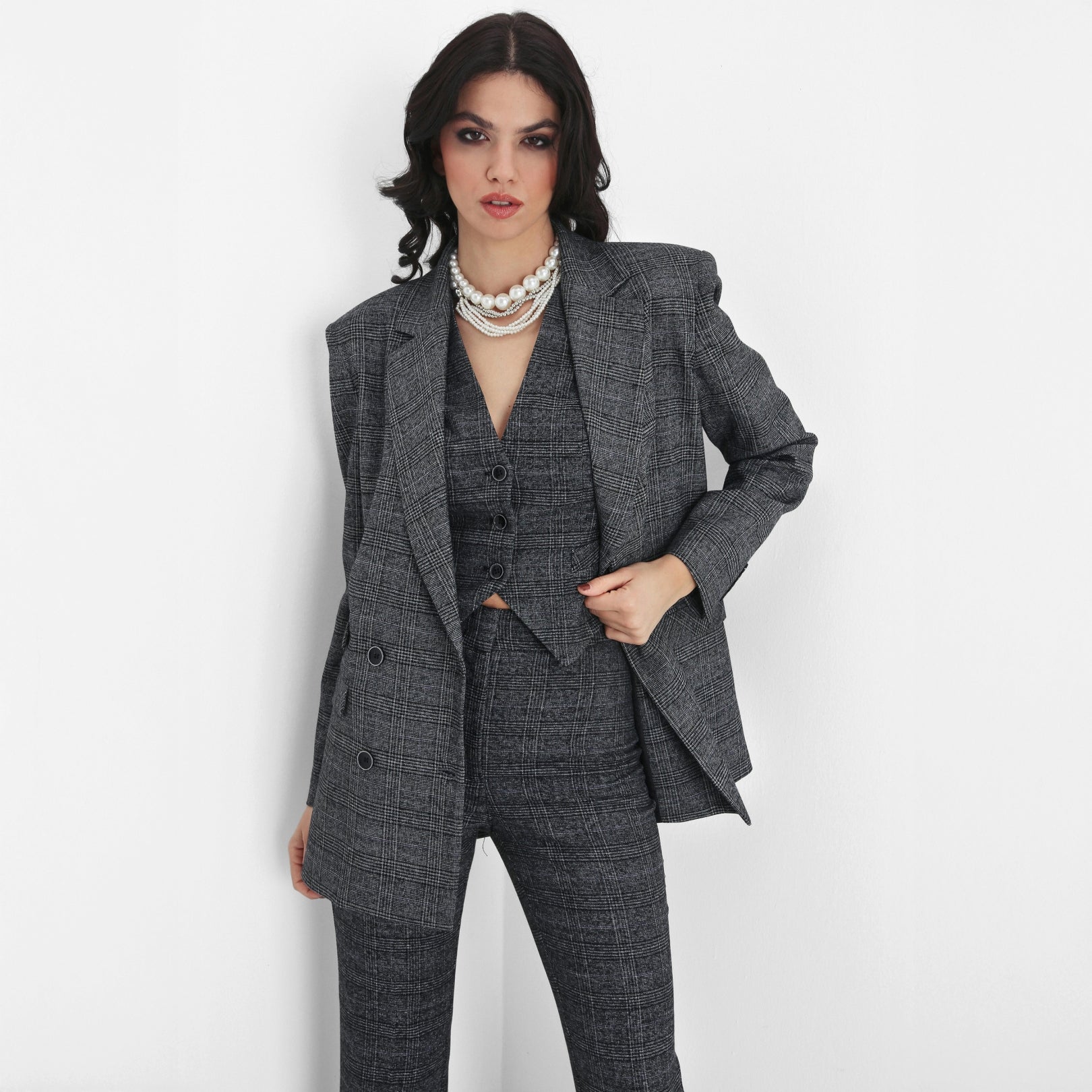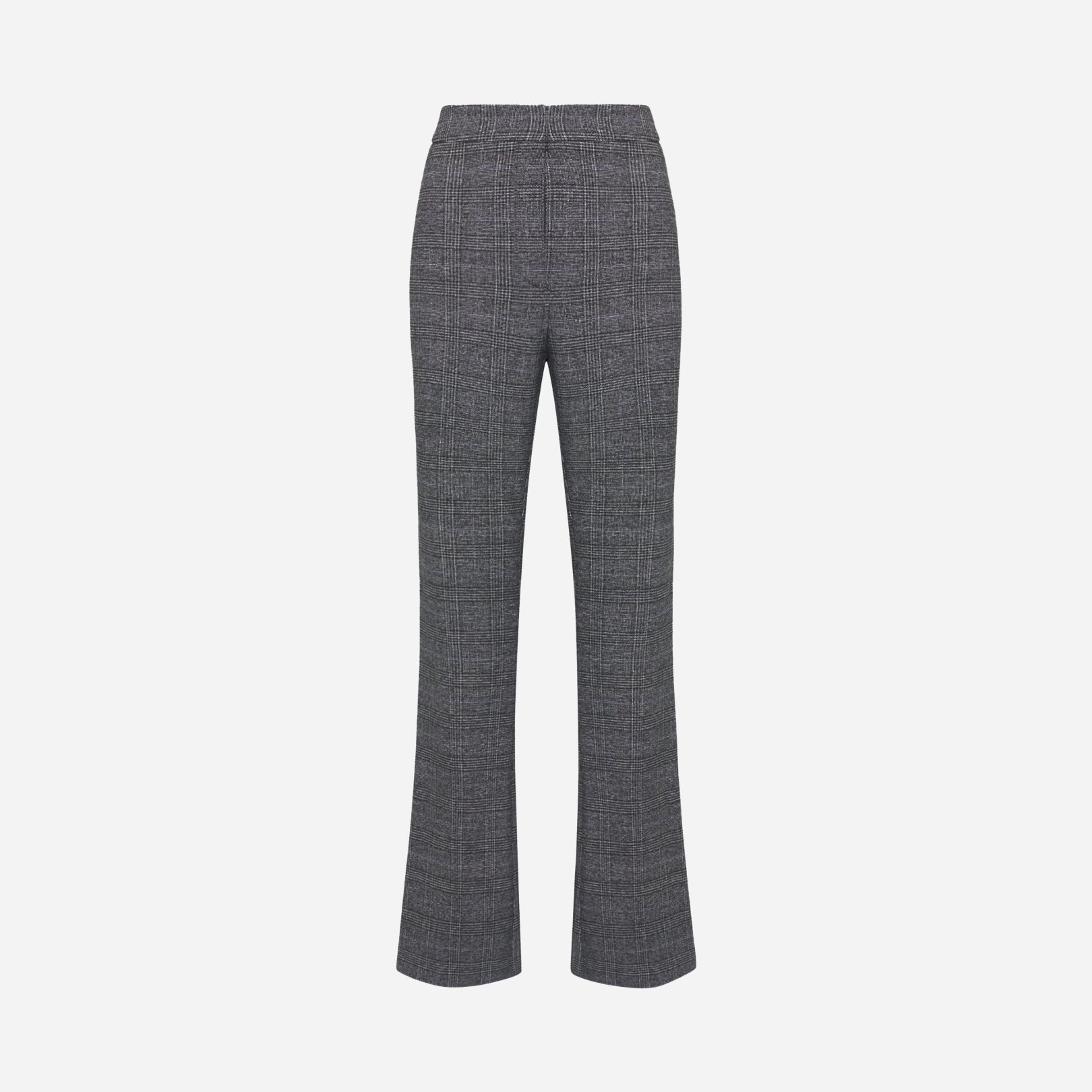 Pantaloni modello flare in principe di Galles dalla vestibilità aderente. Chiusura frontale con zip e gancetto.