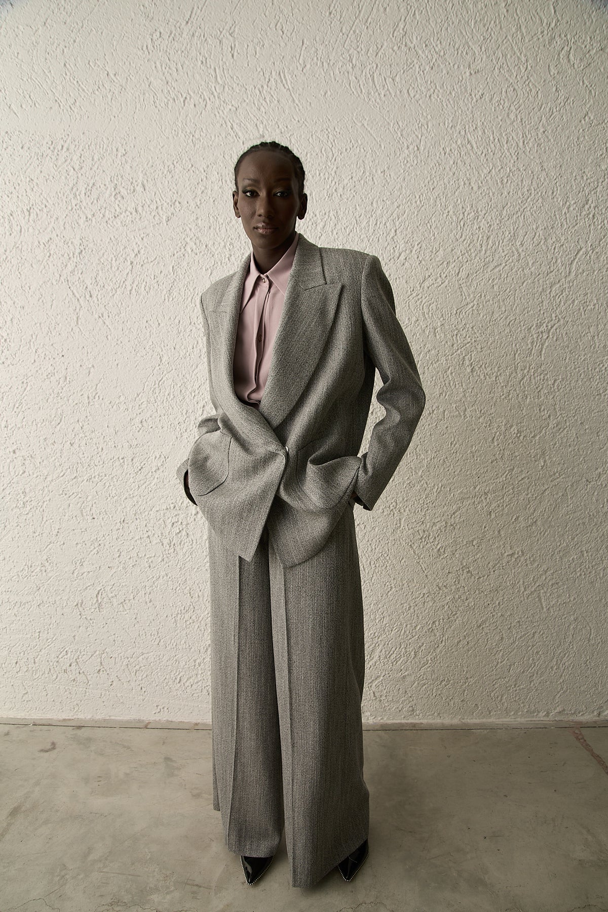 Pantaloni ampi palazzo in lana a spina di pesce. La vita alta e la piega centrale slanciano la silhouette. Tasche a filo e chiusura centrale.