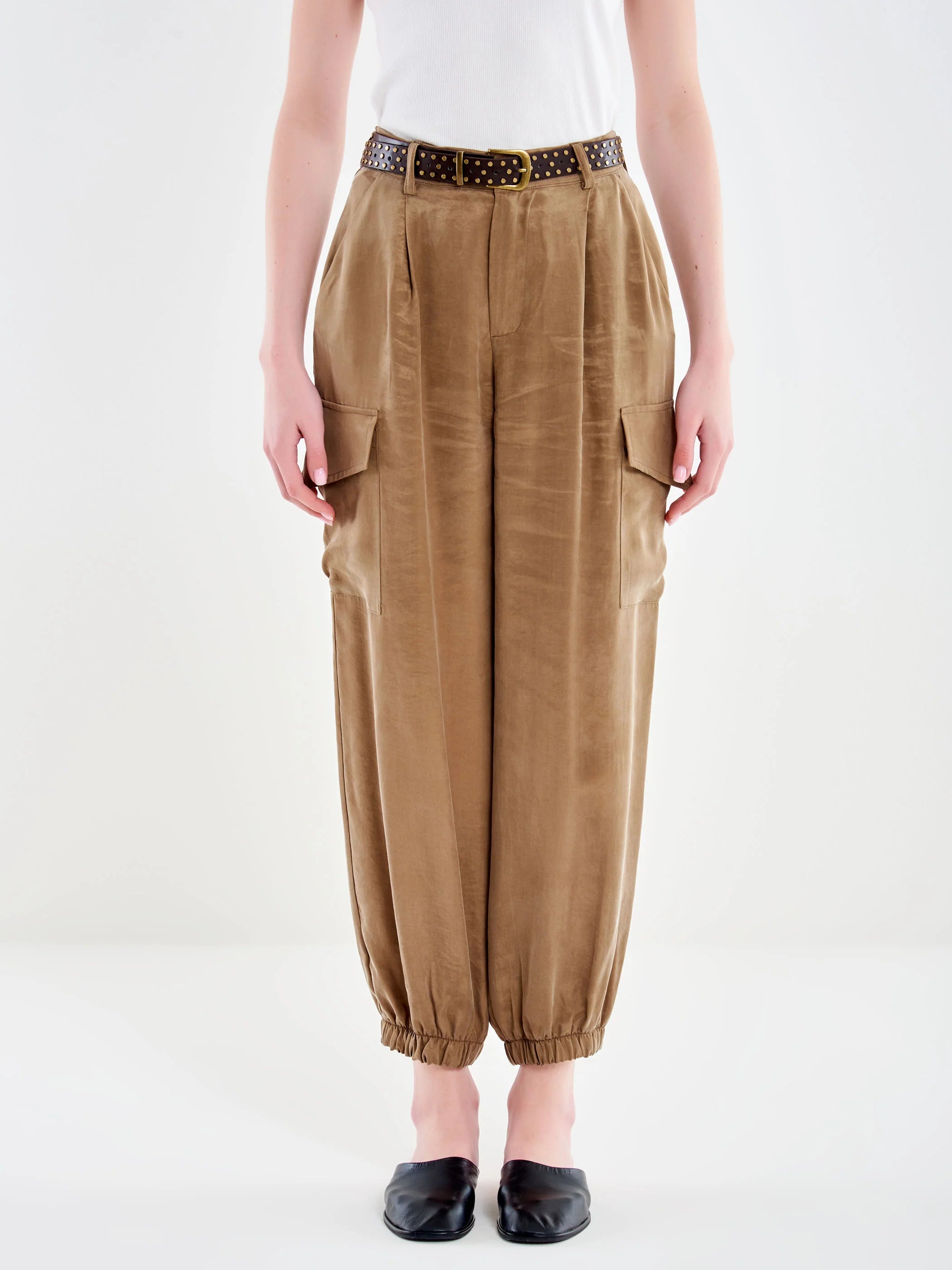Pantaloni lyocell con tascone laterali e cintura. Con elastico sul fondo. Tasche laterali alla francese. Chiusura con zip e bottone. Passanti in vita. Cintura con borchiette inclusa.