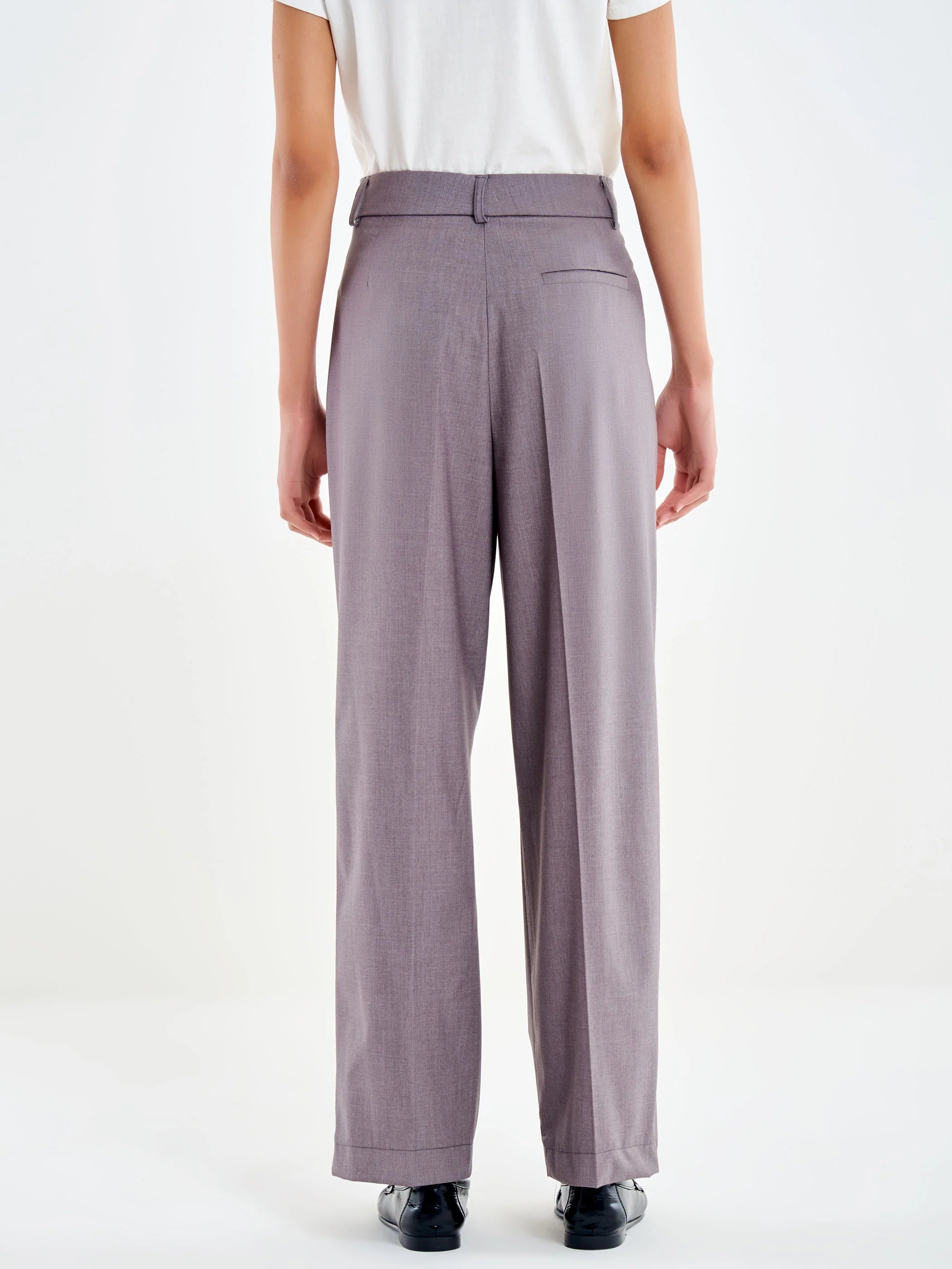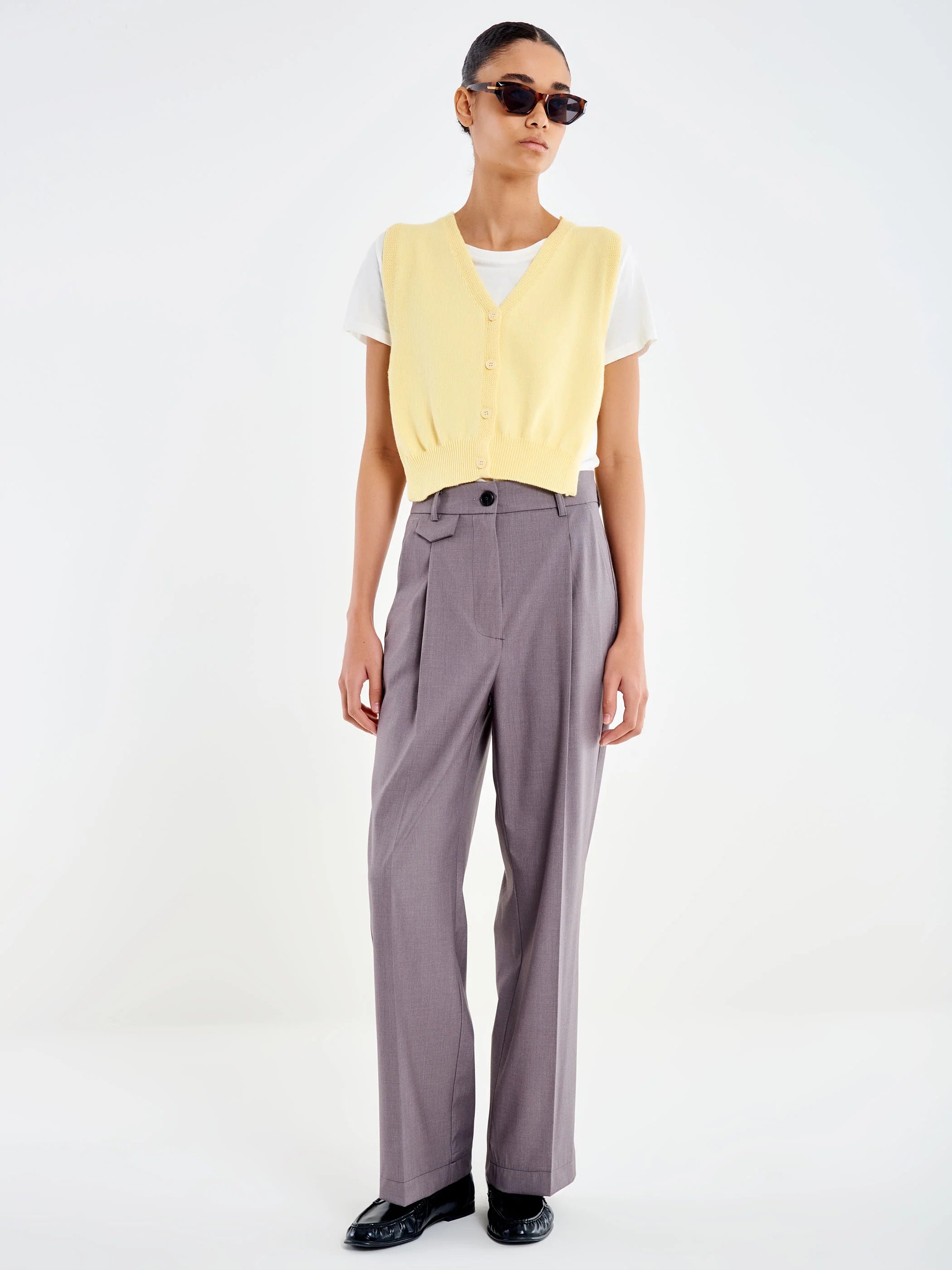 Pantalone palazzo con piega frontale e risvolto sul fondo. Chiusura frontale con zip e bottone. Tasche laterali alla francese. Tasca posteriore a filetto. Finta taschina frontale.