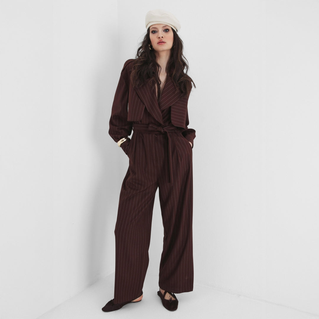 Tuta gessata dal taglio simil-trench con mantellina e rever a lancia che delinea la scollatura. Stretto da cintura in vita e pantaloni palazzo.
